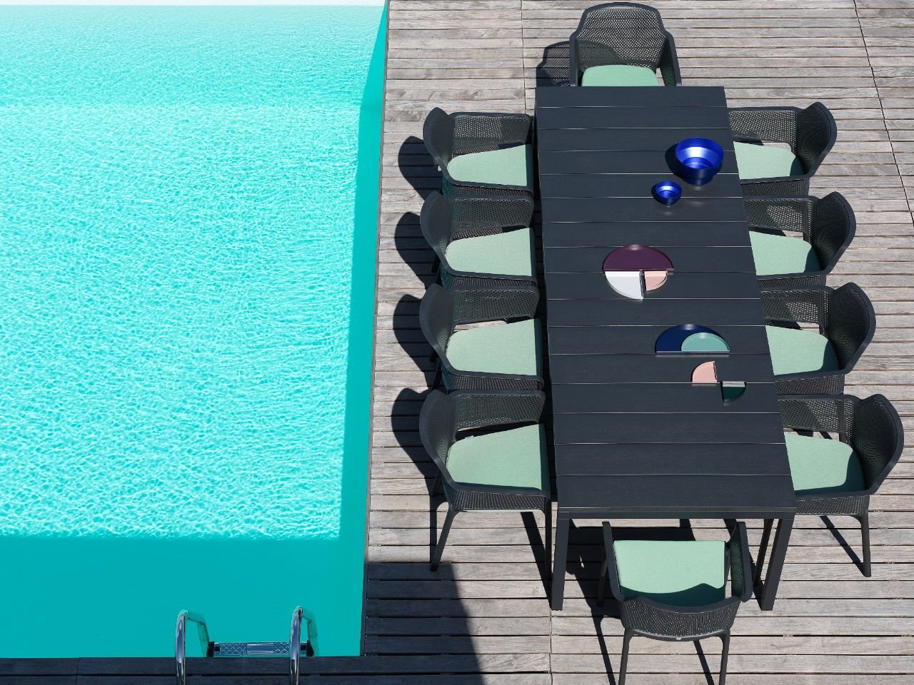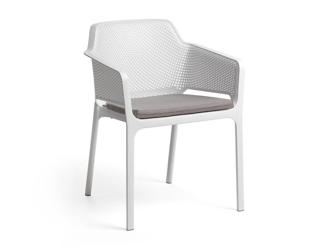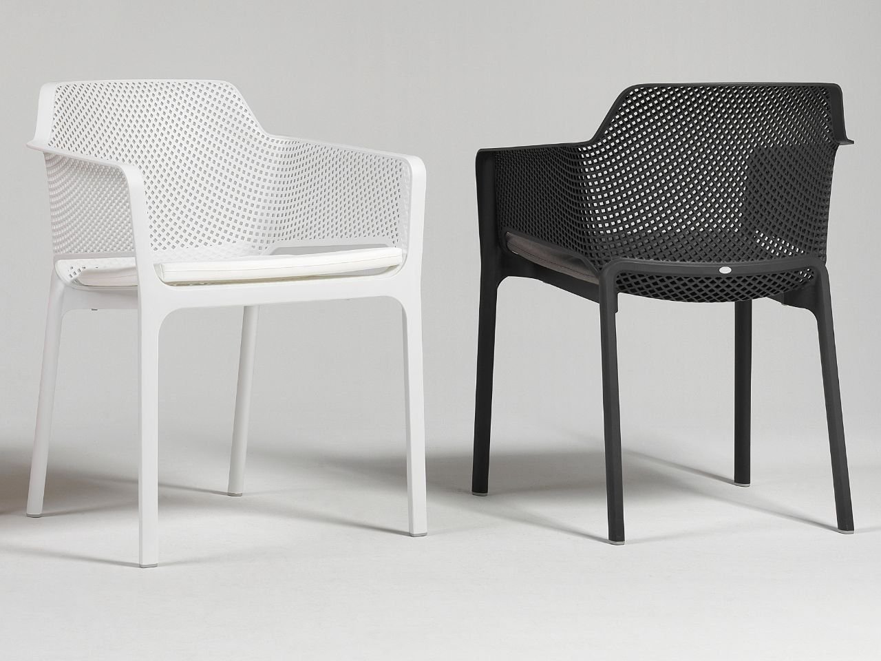 Relajación refinada para Net, monocasco en resina de fibra de vidrio cuidadosamente perforado con un motivo de agujeros cuadrados y redondeados distribuidos de forma continua en la superficie tridimensional del asiento.