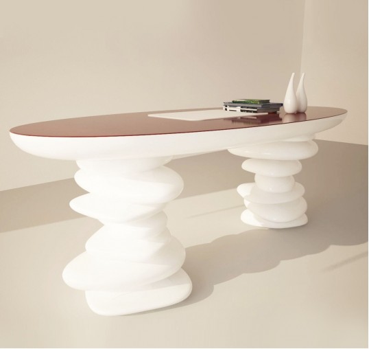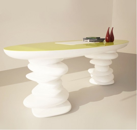 Las dos patas que lo sostienen tienen la forma de piedras superpuestas.