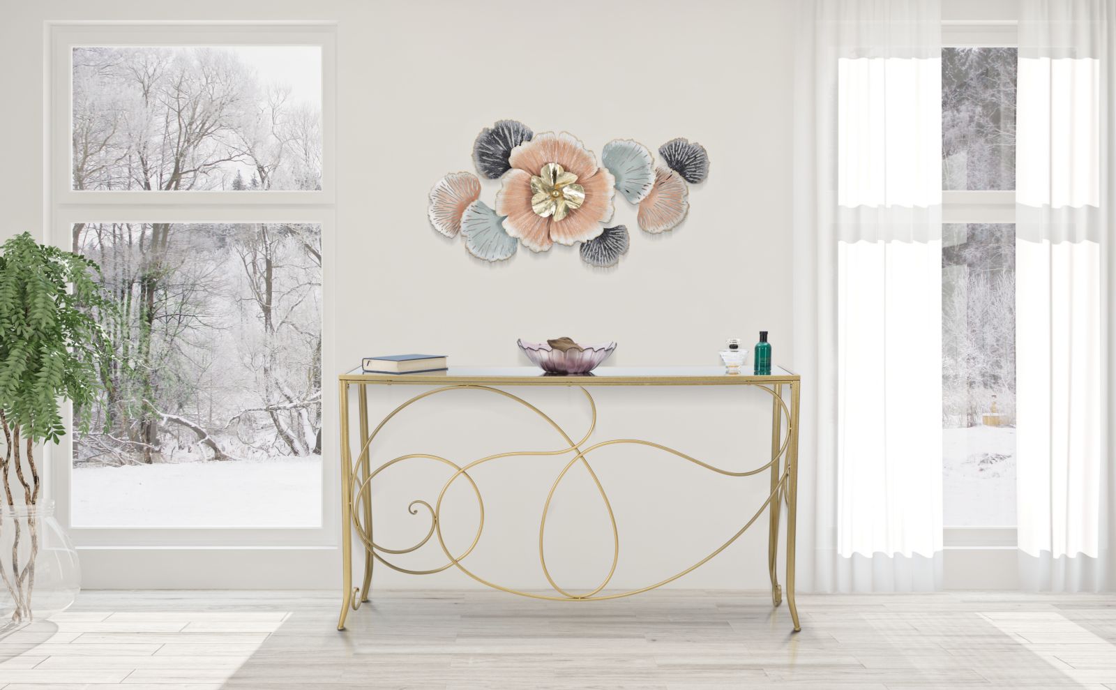 Consola rectangular en metal dorado y tapa de cristal espejado de líneas suaves y sinuosas. El metal dorado le da un toque de clase a cualquier ambiente glamoroso. Las líneas geométricas y redondeadas combinan a la perfección con cualquier tipo de mobiliario.