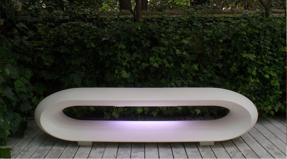 Su diseño curvo, esencial y envolvente destaca por sus formas fluidas y modernas, mientras que la iluminación LED integrada confiere al banco una sugerente presencia luminosa, ideal para jardines, terrazas, lugares públicos, hoteles y espacios contract.
