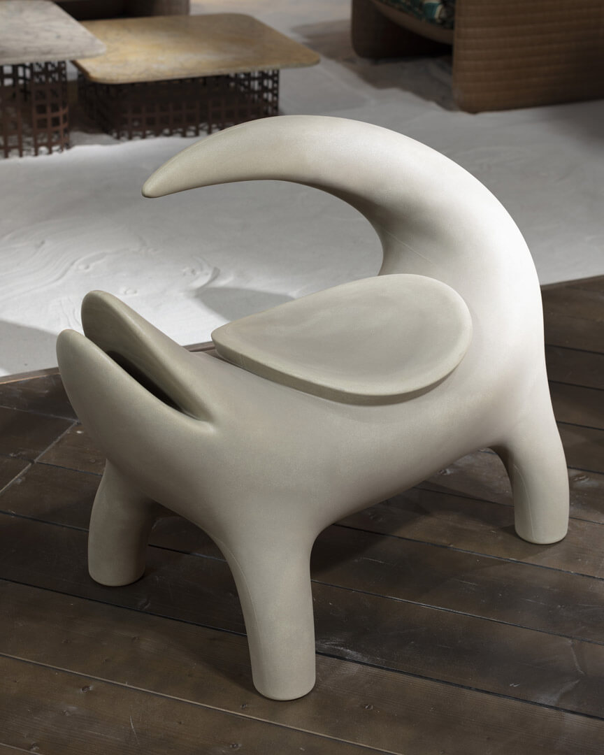 Marcantonio transforma uno de los animales más iconográficos en un compañero ideal para relajarse al aire libre. Ganadora del premio GREEN GOOD DESIGN 2022, Kroko es una butaca que, con sus líneas redondeadas, añade ironía a los espacios que ocupa. Una obra industrial que hace un guiño a la escultura, con referencias a la Naturaleza y al arte contemporáneo, donde la forma sólo se insinúa pero es inconfundible. Kroko está fabricado con un bioplástico derivado del refinado de la caña de azúcar, que recuerda los colores de la Tierra y que SLIDE utiliza por primera vez en el mundo del diseño. Kroko también está disponible en la versión biplaza, Big Kroko, y forma parte de la colección Afrika junto con Threebù, Threebù Pot, Threebù Totem y Threebù Party.
