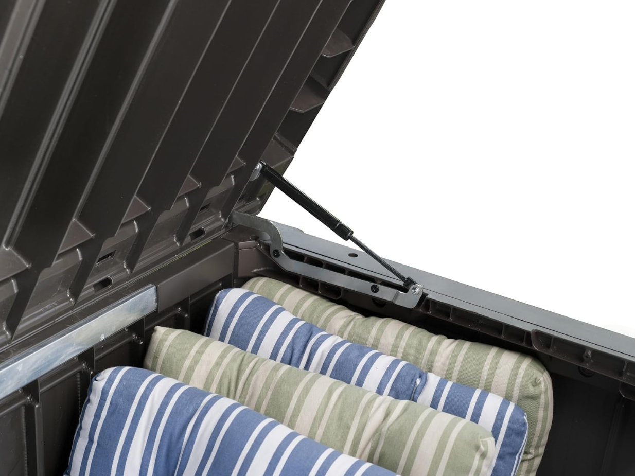 Gracias a su capacidad de 570 litros , es perfecto para guardar cojines, herramientas de jardín, accesorios de piscina o juegos de exterior de forma ordenada y siempre resguardada.