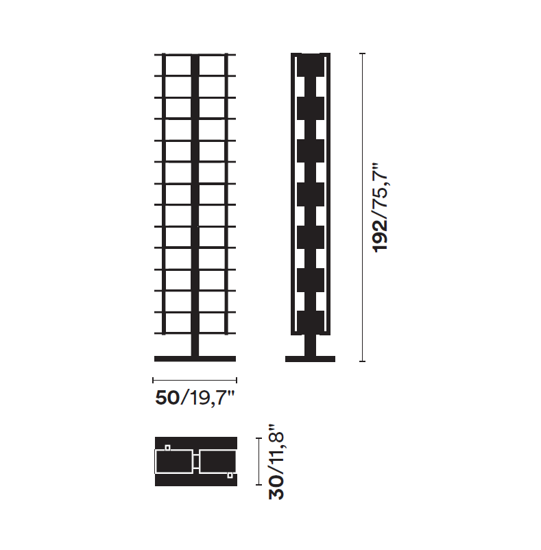 Librería vertical de pie. También se puede utilizar como elemento divisor de doble cara. Compuesto por estantes centrales y doble fila de estantes en metal lacado negro o blanco, base en acero inoxidable pulido o lacado blanco integral. Dos topes de libro en acero inoxidable pulido. Contiene alrededor de 170 volúmenes o 560 cd. Base grabada con la firma del diseñador. Diseño Bruno Rainaldi Dimensiones: 50x30xh192 cm Especifique por correo electrónico a info@tecnoarredo3.com si desea la variante blanca con base blanca o negra con base de acero inoxidable