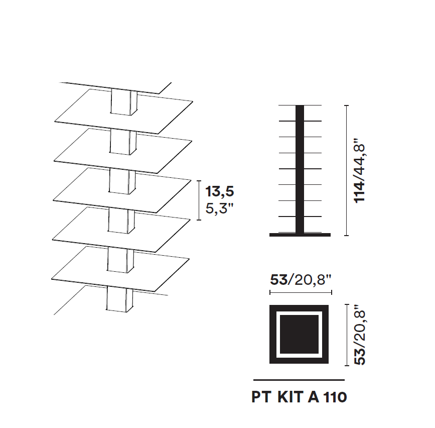 Librería vertical autoportante y giratoria de 360 °. Base grabada con la firma del diseñador. Disponible en tres versiones diferentes: Kit A, Kit B, Kit C. Acabado: Estructura y estantes en metal lacado blanco o negro. Base de acero inoxidable pulido para la versión en negro y lacado en blanco para la versión en blanco. Accesorios: Extensión en metal lacado blanco o negro. El imán detiene el cd. Dimensiones: 52x52xh110 cm El precio se refiere a la instalación Una altura de 110 cm compuesta por 8 estantes espaciados a 13 cm de distancia, colocando los libros horizontalmente. 240 libros totales, 680 cd totales. Especifique por correo electrónico a info@tecnoarredo3.com si desea la variante BLANCO BASE BLANCO o BASE NEGRA INOXIDABLE