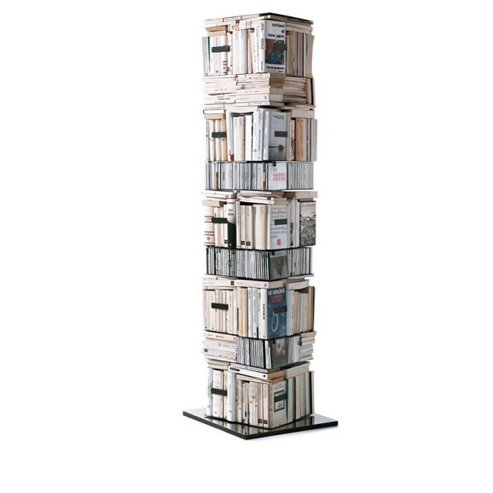 Librería vertical autoportante y giratoria de 360 °. Base grabada con la firma del diseñador. Disponible en tres versiones diferentes: Kit A, Kit B, Kit C. Acabado: Estructura y estantes en metal lacado blanco o negro. Base de acero inoxidable pulido para la versión en negro y lacado en blanco para la versión en blanco. Accesorios: Extensión en metal lacado blanco o negro. El imán detiene el cd. Dimensiones: 52x52xh197 cm El precio se refiere a la configuración C que consta de 5 estantes separados 26 cm y 4 estantes separados 13 cm. Posicionamiento vertical y horizontal de libros. Unos 295 volúmenes totales. Especifique por correo electrónico a info@tecnoarredo3.com si desea la variante BLANCO BASE BLANCO o BASE NEGRA INOXIDABLE