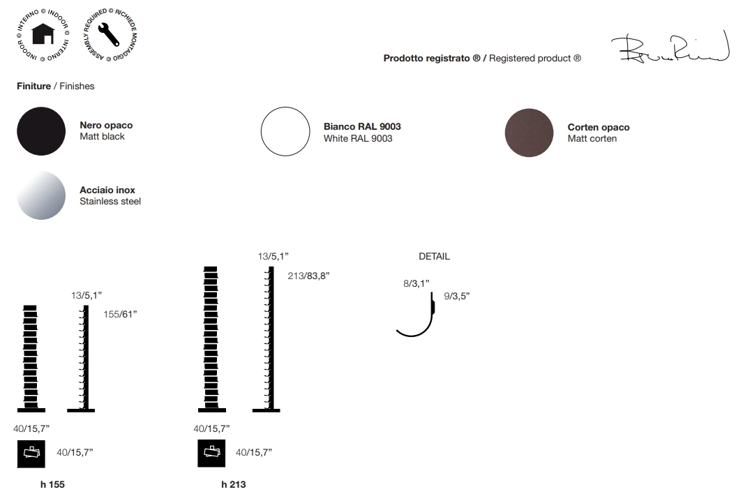 Acabados de columnas y estantes: lacado negro y efecto corten mate, lacado blanco brillante RAL 9003, acero inoxidable espejo con estantes internos en acabado satinado.