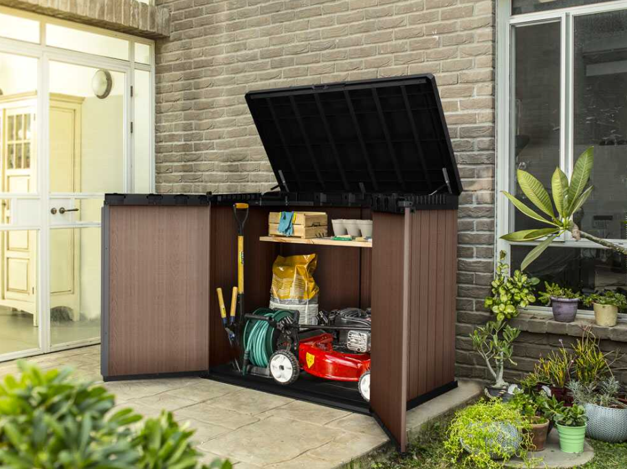 Su diseño compacto y elegante efecto madera lo hace perfecto incluso para terrazas o patios con espacio limitado, ofreciendo amplia capacidad sin excesivo volumen.