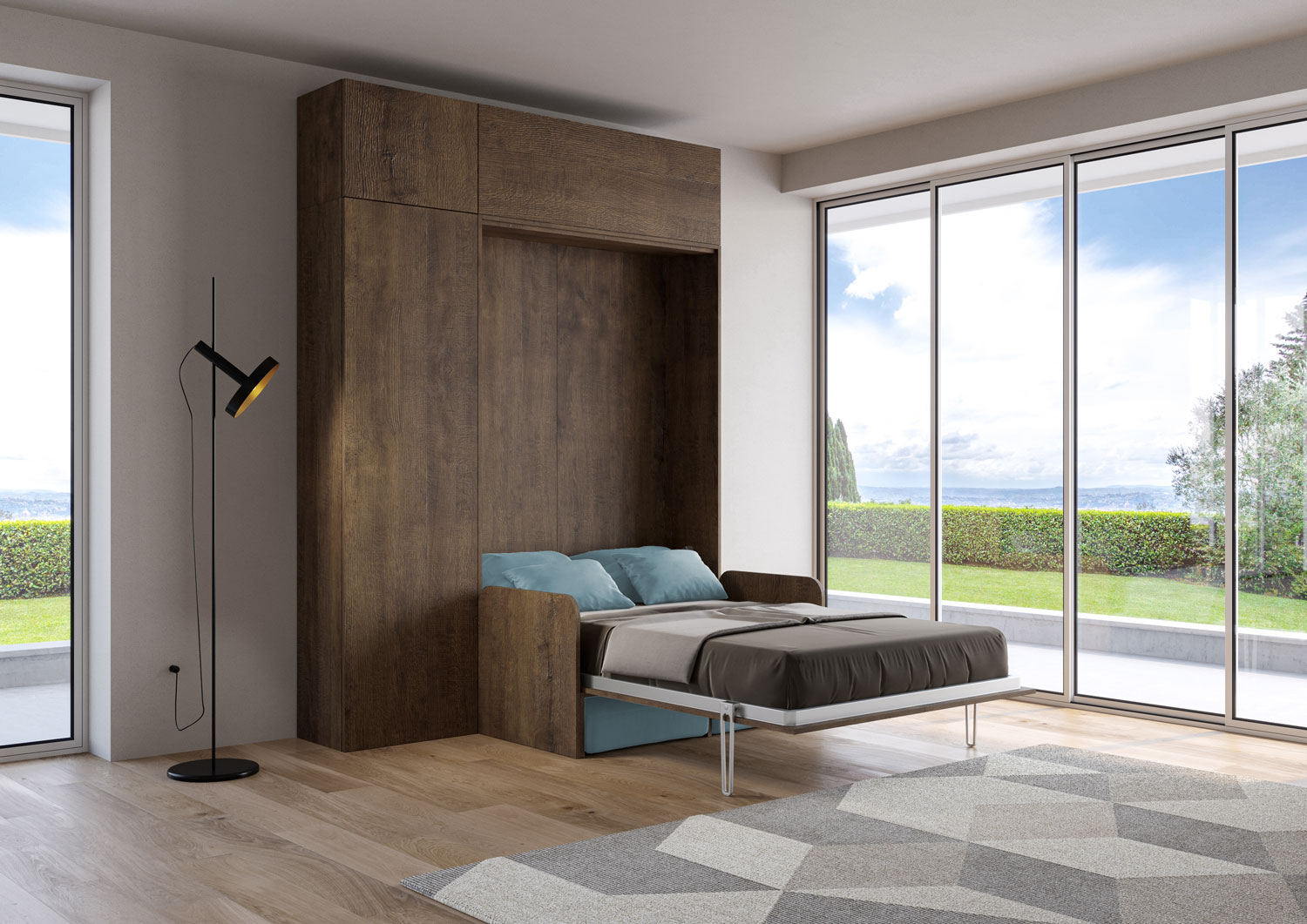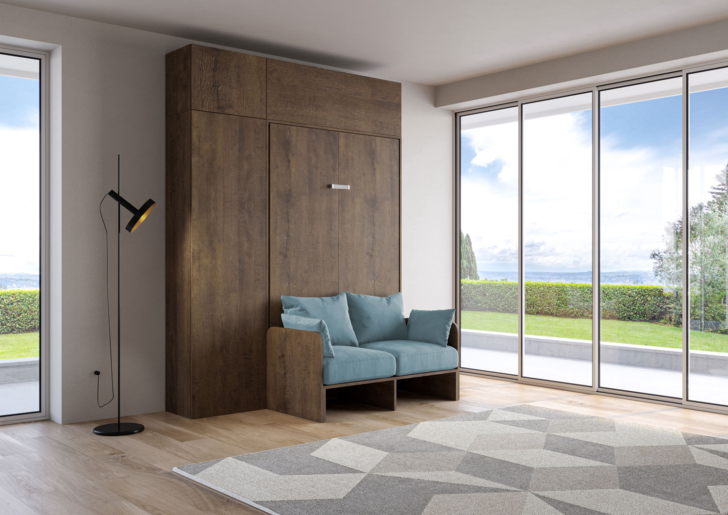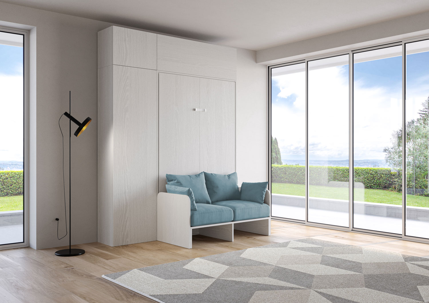 Material Cama abatible doble a la francesa Kentaro Sofà vertical, disponible en la versión con sofá, columna y dos módulos a paredes superiores de la línea Isoka. Una composición original y multifuncional extremadamente versátil, que permite transformar en pocos p