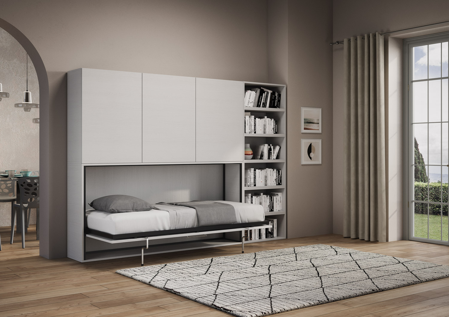 | Material | Kando G es una cama individual abatilble que se transforma en una librería / armario con nueve compartimentos (tres con puertas y estantes interiores y seis muebles con estante abierto). Es una solución original y práctica que permite optimizar el espacio |