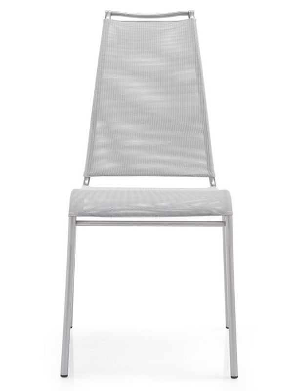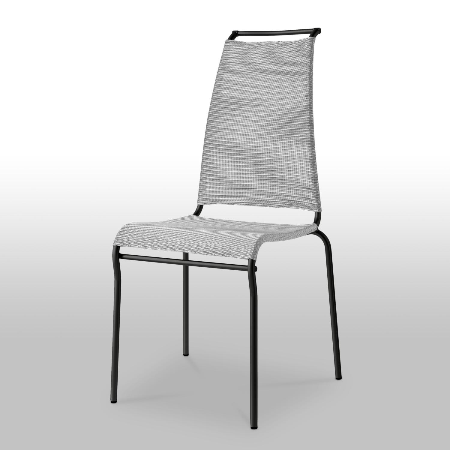 Caracterizada por un cómodo respaldo alto, la silla apilable tiene una estructura de metal, disponible en acabados cromados o barnizados satinados.