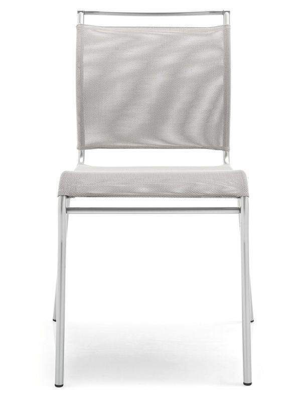 Caracterizada por un cómodo respaldo alto, la silla apilable tiene una estructura de metal, disponible en acabados cromados o barnizados satinados.