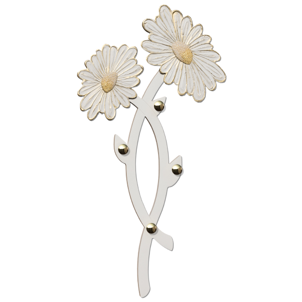 Percha lacada en forma de marfil con dos elementos pintados a mano sobre material de relieve, cuatro perillas cromadas.