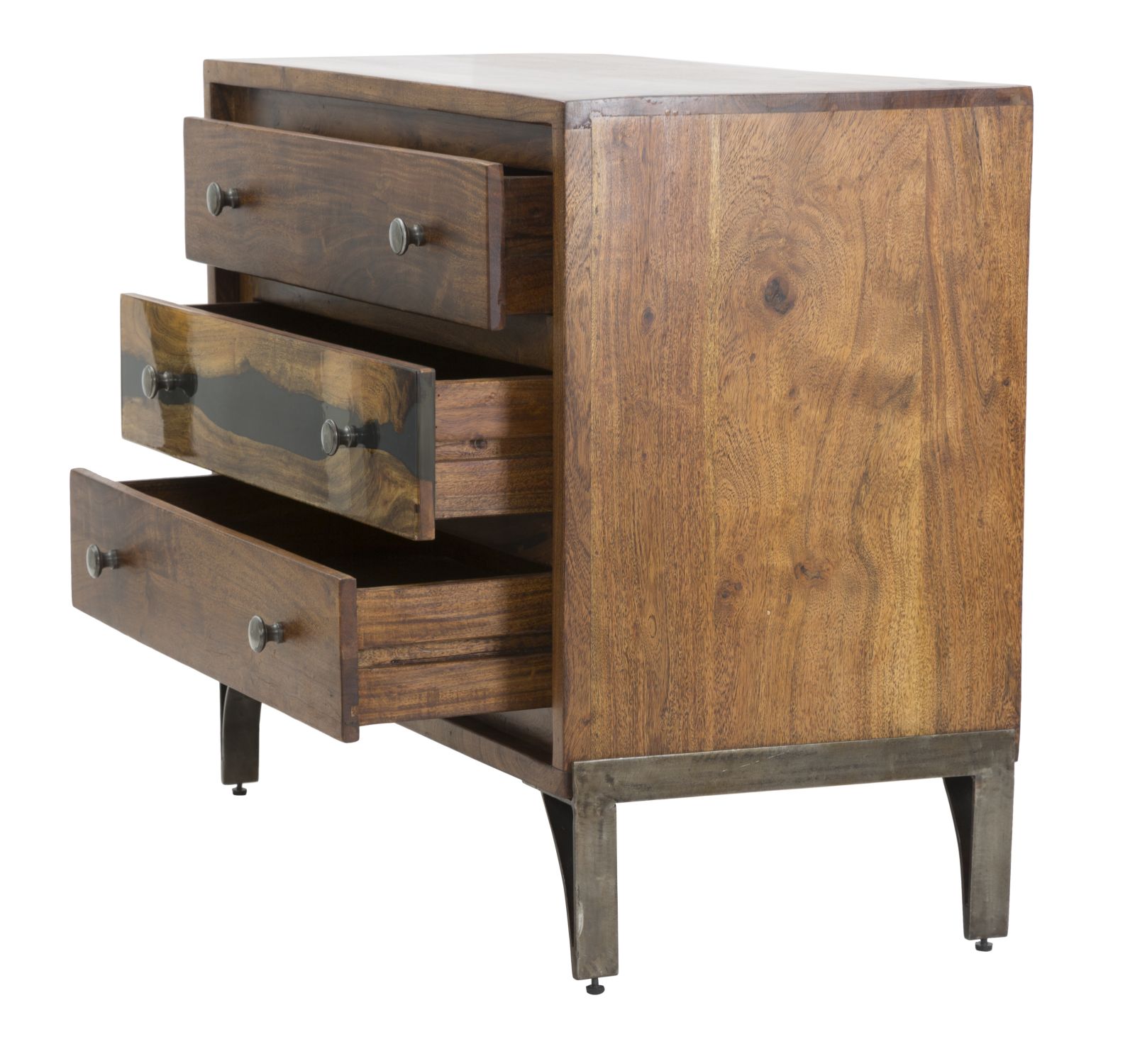 Elegante cómoda en madera maciza de acacia con 3 cajones. La particular elaboración con resina engastada en los cajones da un toque de color y modernidad a una pieza extremadamente elegante y clásica.