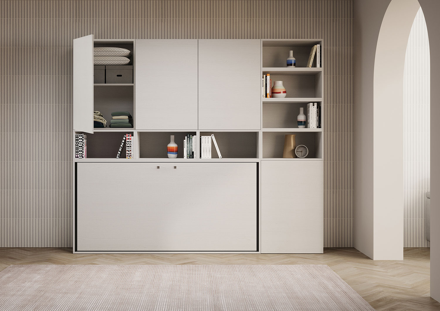 | Material | Kando E es una cama individual abatible en una estantería/armario con once compartimentos (cuatro con puerta y estante interno y siete muebles con estante abierto). Es una solución original y funcional que permite optimizar el espacio disponible ocupando |