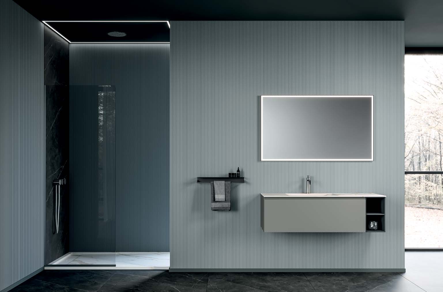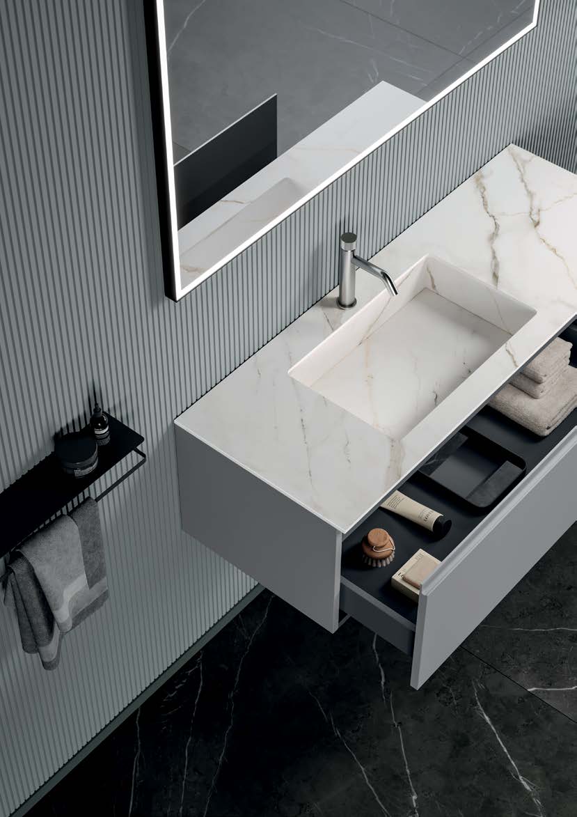 El lavabo integrado, disponible en diferentes variantes, se integra perfectamente en el diseño del mobiliario, mientras que el espejo con luz LED opcional completa el ambiente con un toque moderno y funcional.