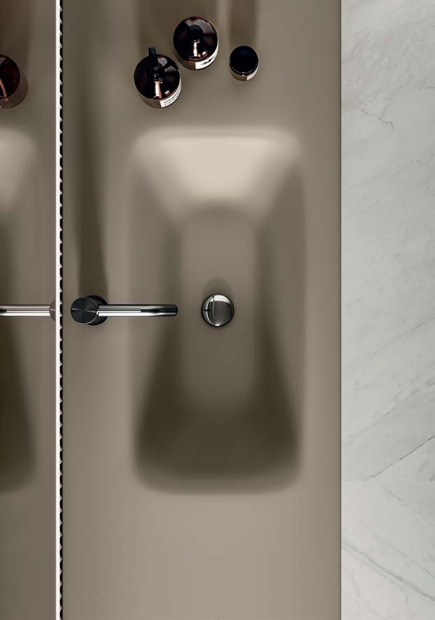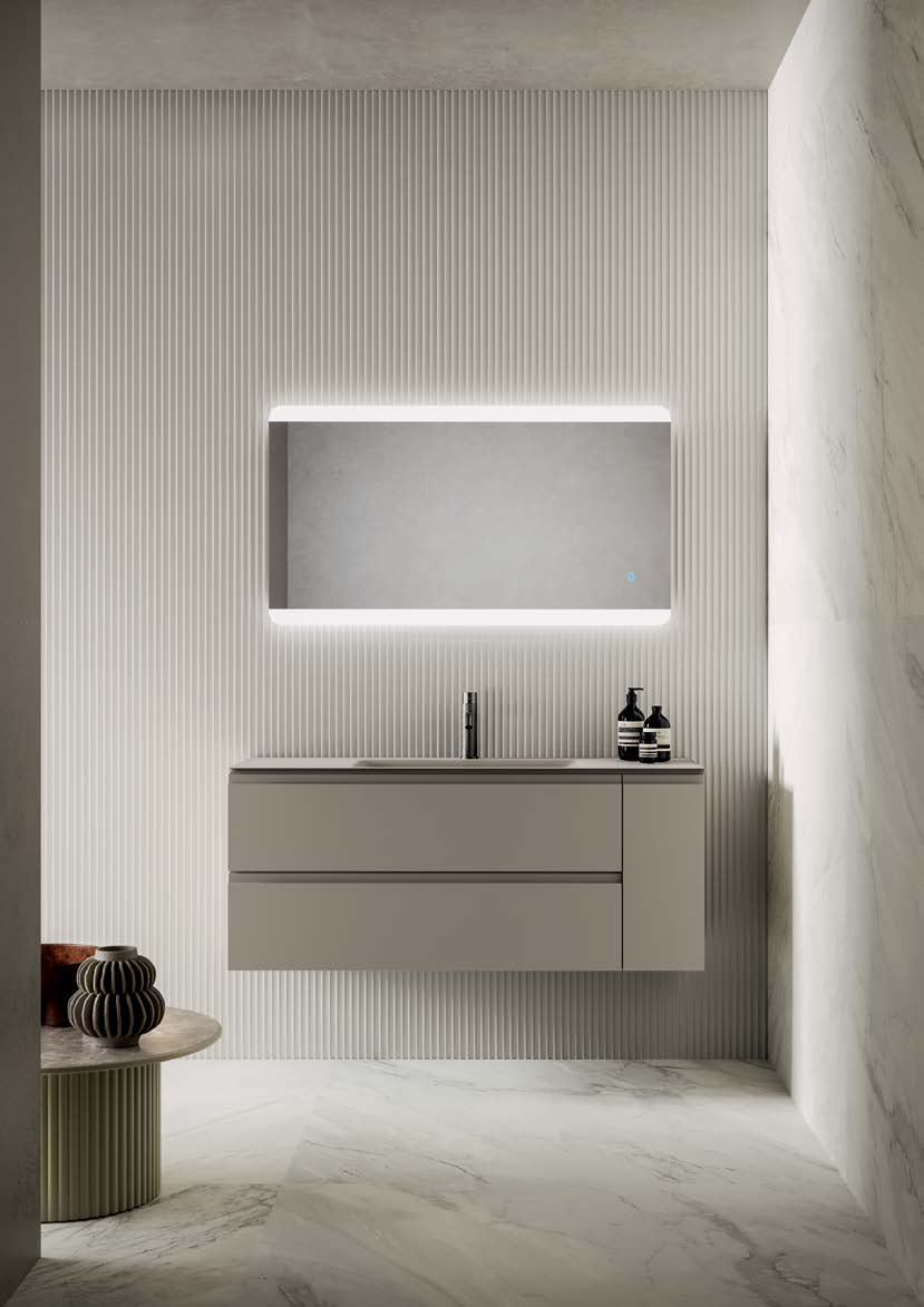 El lavabo integrado combina a la perfección con las líneas limpias del mueble, mientras que el espejo a juego , con opción de iluminación LED, añade un toque contemporáneo y realza la luminosidad del espacio.