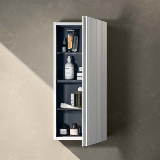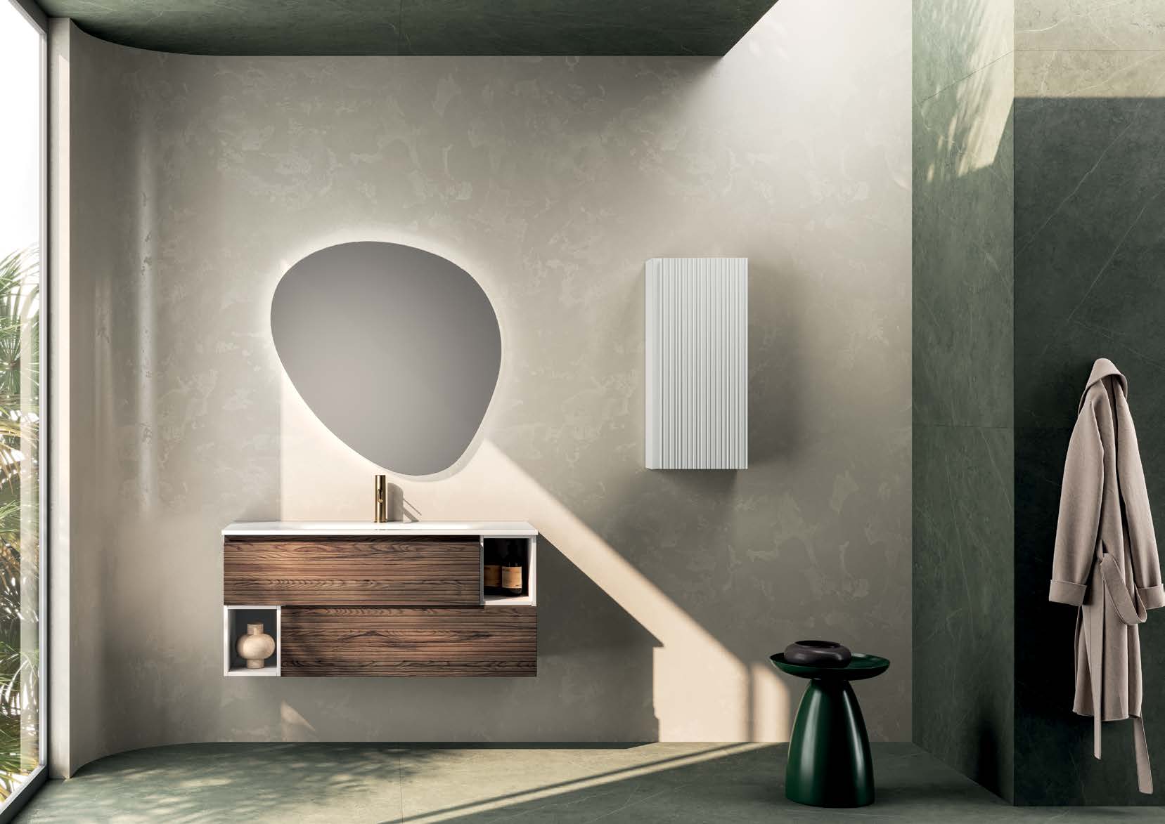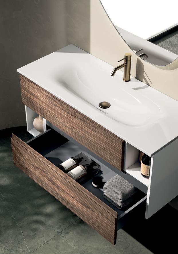 El lavabo integrado de cerámica o resina, según la configuración elegida, añade un toque de refinamiento, mientras que el espejo a juego con luz LED opcional completa el conjunto, haciéndolo práctico y armonioso.