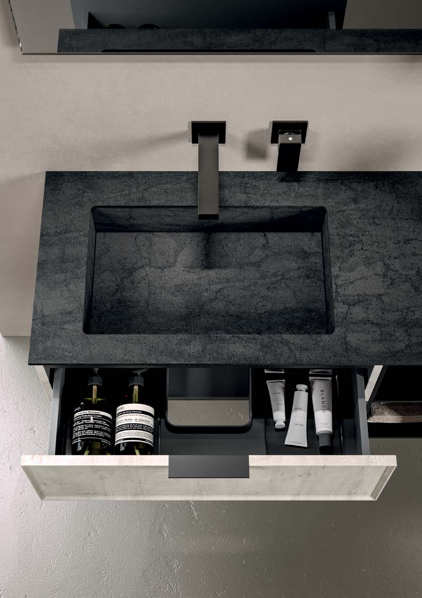 Equipada con un lavabo integrado , amplios cajones con cierre suave y una estructura sólida y resistente a la humedad, esta composición garantiza la máxima comodidad de uso a lo largo del tiempo. La geometría esencial del mobiliario combina a la perfección con accesorios y espejos minimalistas, creando un baño ordenado y refinado.