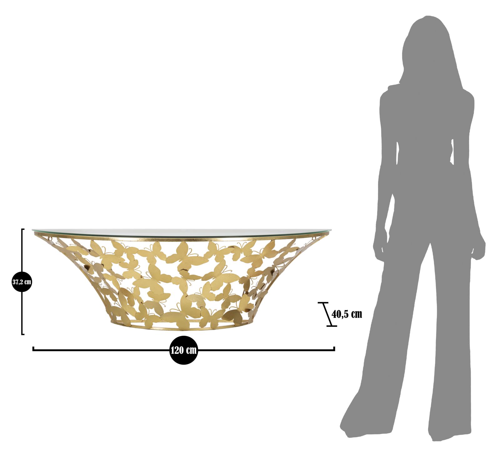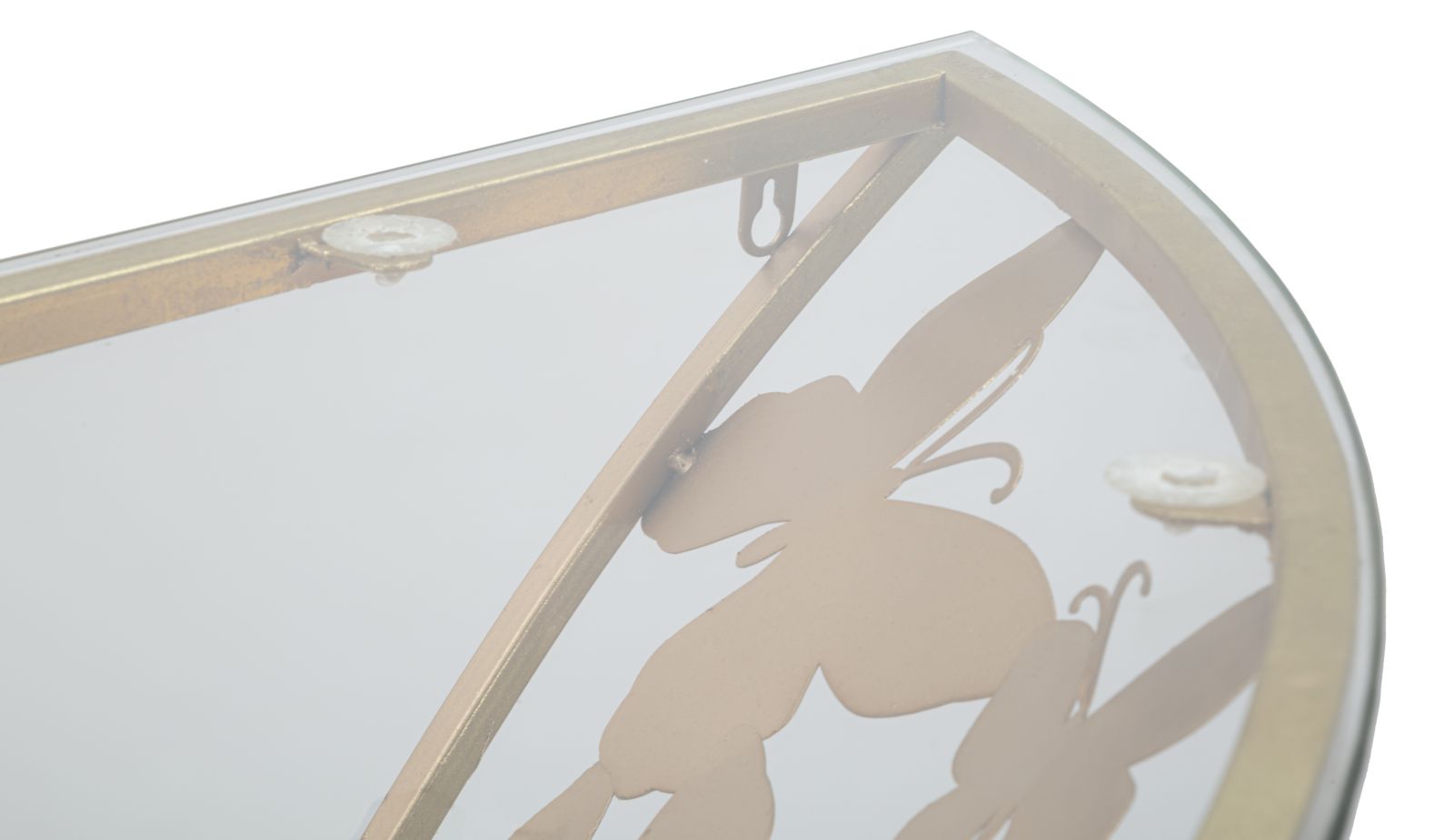 Consola de pared semicircular en metal dorado con tapa de cristal. La base está ricamente decorada con mariposas voladoras. El diseño particular le da un toque de clase y relajación a cualquier ambiente.