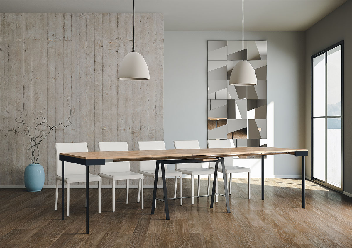 La consola extensible Banco Evolution es versátil y robusta, lo que la convierte en el complemento perfecto para cualquier estancia del hogar: recibidor, cocina, comedor, salón o pasillo. Se transforma fácilmente en una gran mesa de comedor de hasta 300 cm de largo, con capacidad para 14 personas. Fabricada con paneles revestidos de melamina, con estructura y patas de hierro. El sistema de extensión con guías telescópicas de aluminio y los soportes laterales incluidos la hacen estable y robusta. Una vez cerrada, las extensiones deben guardarse. Producto Itamoby, fabricado en Italia. Dimensiones: Consola cerrada: An. 90 Pr. 40 Al. 77 cm. Largo con 1 extensión: 92 cm. Largo con 2 extensiones: 144 cm. Largo con 3 extensiones: 196 cm. Largo con 4 extensiones: 248 cm. Largo con 5 extensiones: 300 cm.
