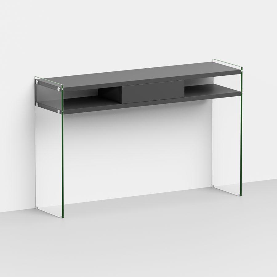 Consola Maya con cajón, fabricada en laminado ecológico de 25 mm para la tapa y 18 mm para el cuerpo, con laterales en vidrio templado de 10 mm de espesor.