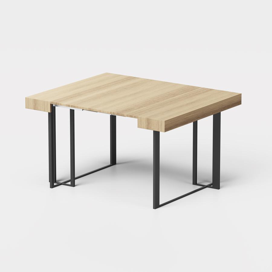 Consola extensible con estructura de acero pintado y tapa en laminado ecológico con acabado abatible.