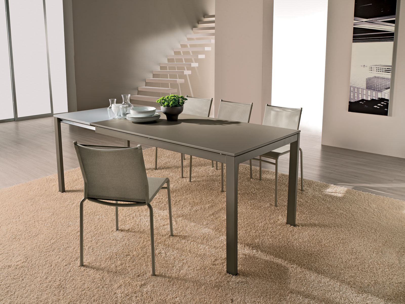 Mesa extensible con estructura en acero lacado de aluminio M089, blanco M306, arena M312, marrón oscuro M307, antracita M310 o negro M055, la parte superior está disponible en: - melamina blanca L043 - melamina arena L044 - melamina antracita L045 - melamina aluminio L072 Dimensiones : Longitud: 140 (cerrado) - 200 (abierto) cm Profundidad: 80 cm Altura: 75 cm Especifique el color por correo electrónico en info@tecnoarredo3.com Aumento de la estructura cromada G093 para información contacte info@tecnoarredo3.com