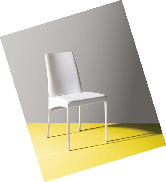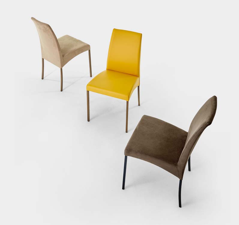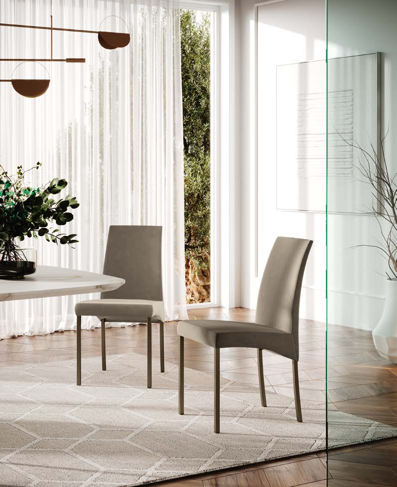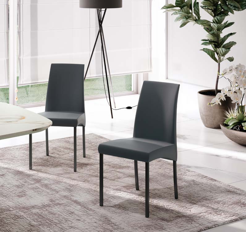 Silla con estructura de acero lacado, asiento y respaldo acolchado y tapizado en Ecopiel, Econabuk, tejido Penny, tejido Bouquet y Ecopiel Premium.