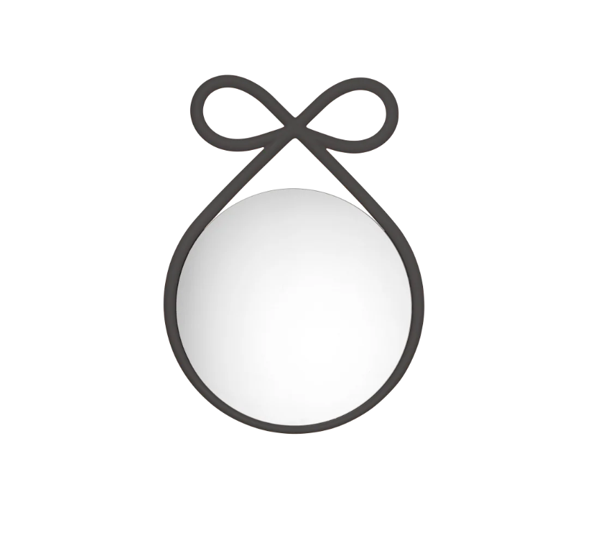 El lazo, fabricado en polipropileno y disponible en varios colores, enmarca el espejo con ligereza y personalidad.
