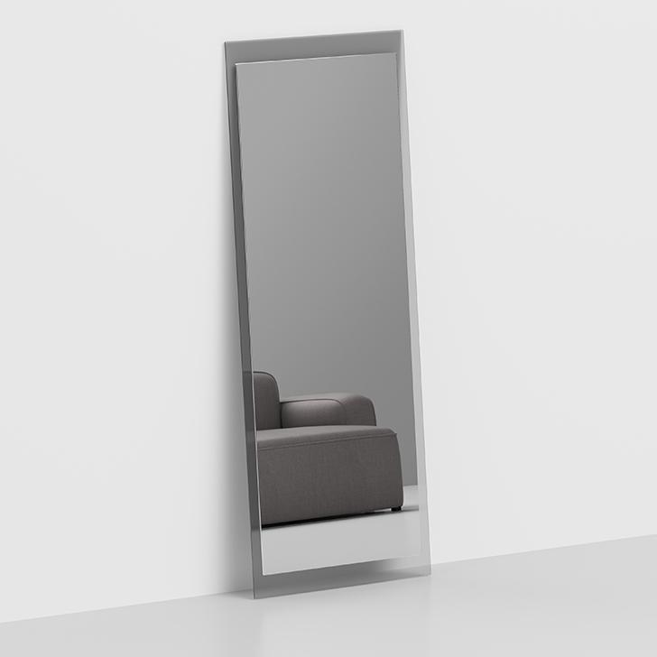 Espejo Elodie con cristal transparente gris ahumado (o bronce) que enmarca el cristal del espejo del mismo color.