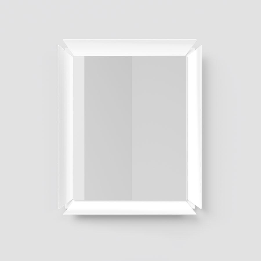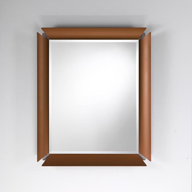 Espejo de pared con marco de aluminio lacado mate, fijado sobre fondo laminado de color.
