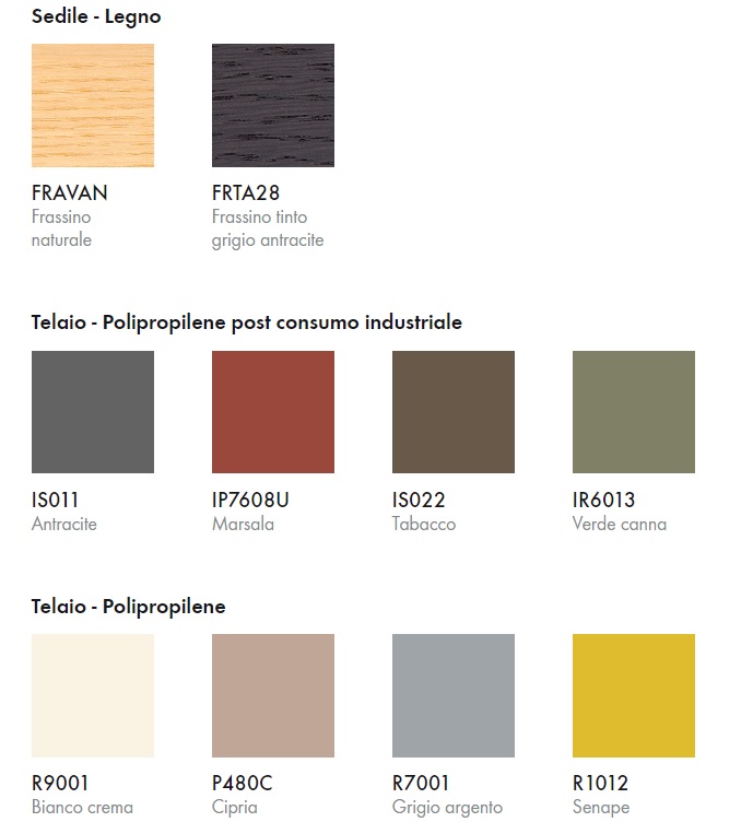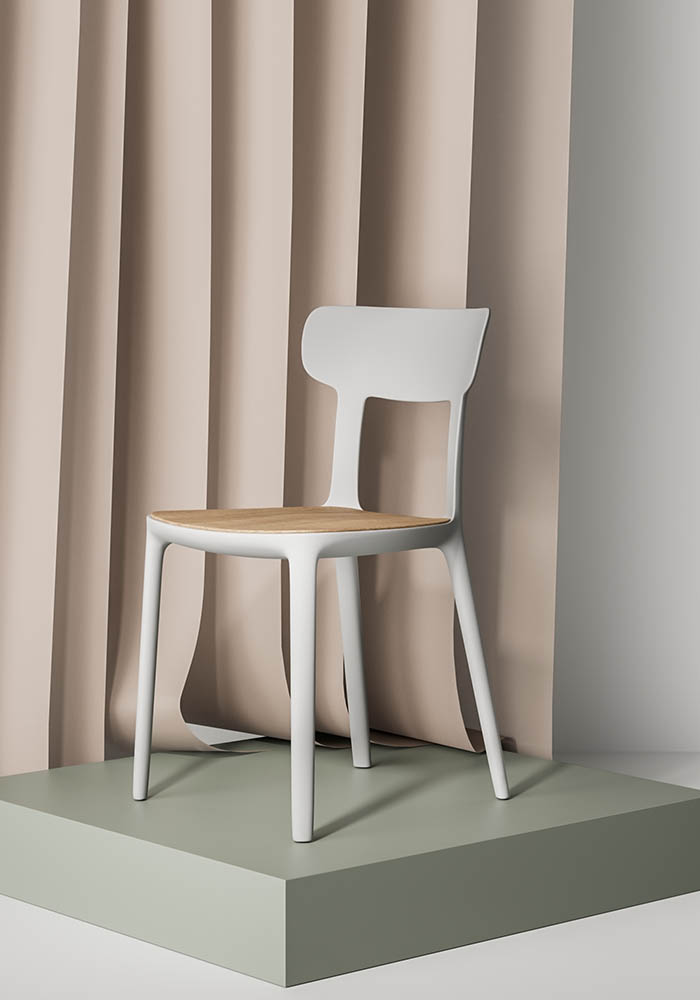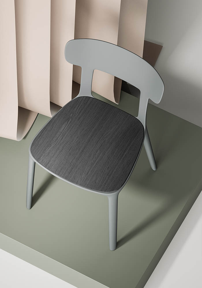 Silla monobloc en polipropileno reciclado disponible en una variada paleta de colores originales. El asiento también está disponible en madera de fresno, proporcionando una alternativa más elegante al clásico asiento tapizado.