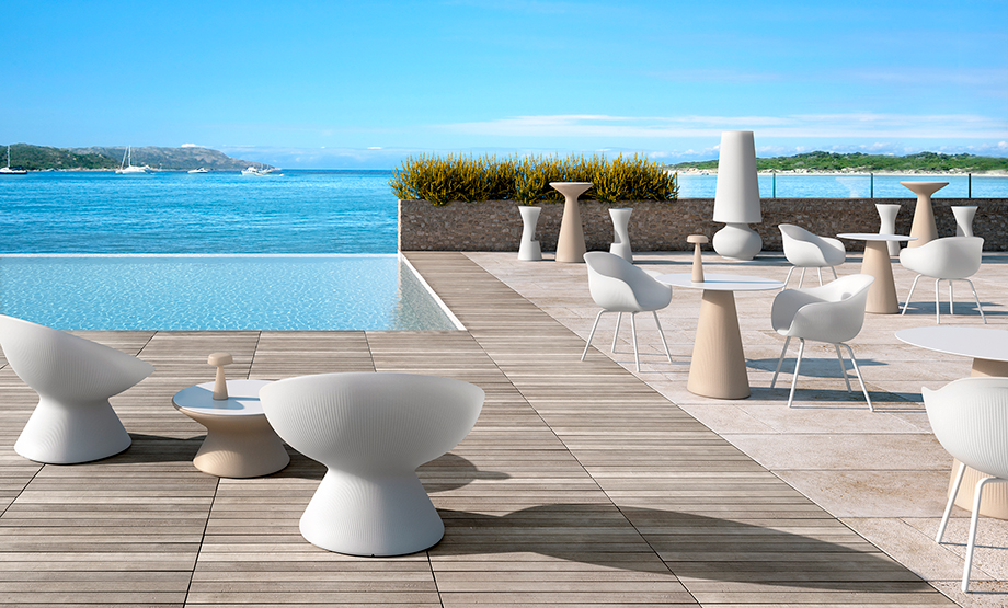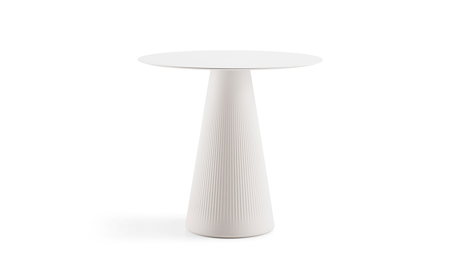Mesa de una sola pata con volumen geométrico, modular, con tablero de HPL disponible en versión redonda y cuadrada. Gracias a su superficie rayada, se crean sugerentes juegos de sombras. En la versión "luz blanca", la mesa se vuelve luminosa y la luz difundida por las superficies crea atmósferas mágicas.