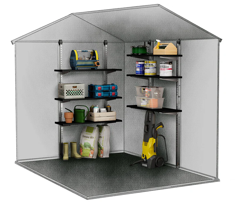 Robusto y funcional, está compuesto por 4 espaciosos estantes capaces de soportar hasta 25 kg cada uno , perfectos para guardar herramientas, cajas, productos del hogar o artículos de jardinería.