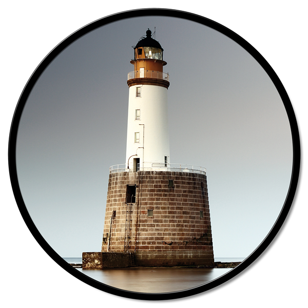 Panel redondo de fibra de madera recubierto de lona de puro algodón estampado en alta definición y con estructura de metal lacado mate.