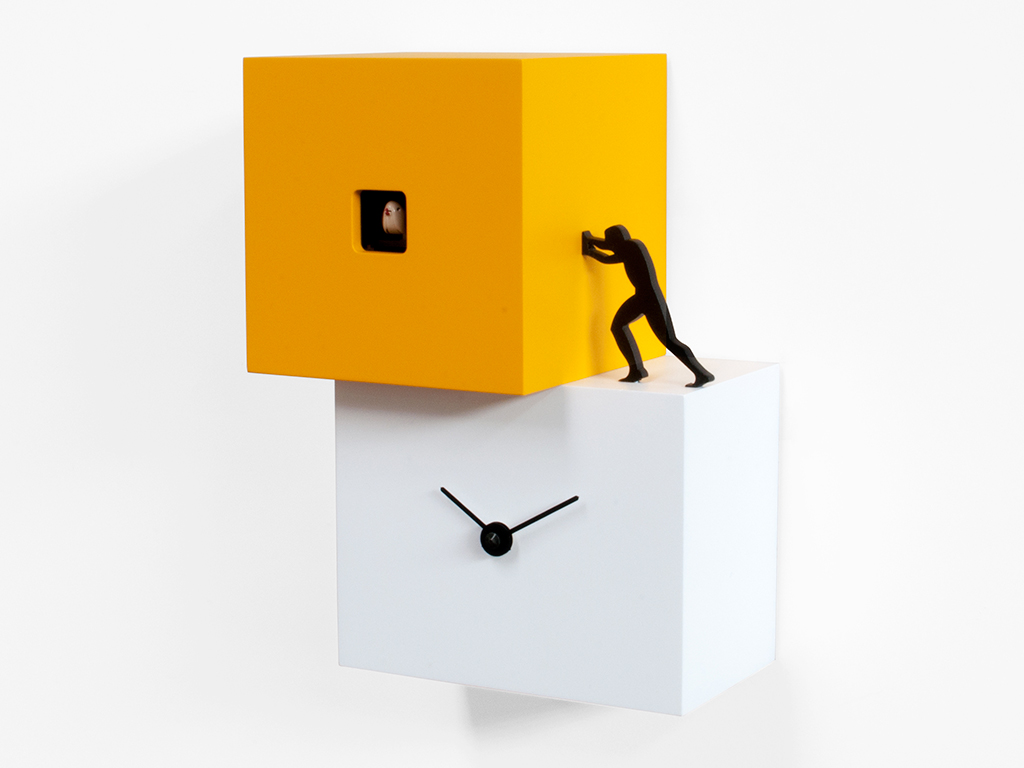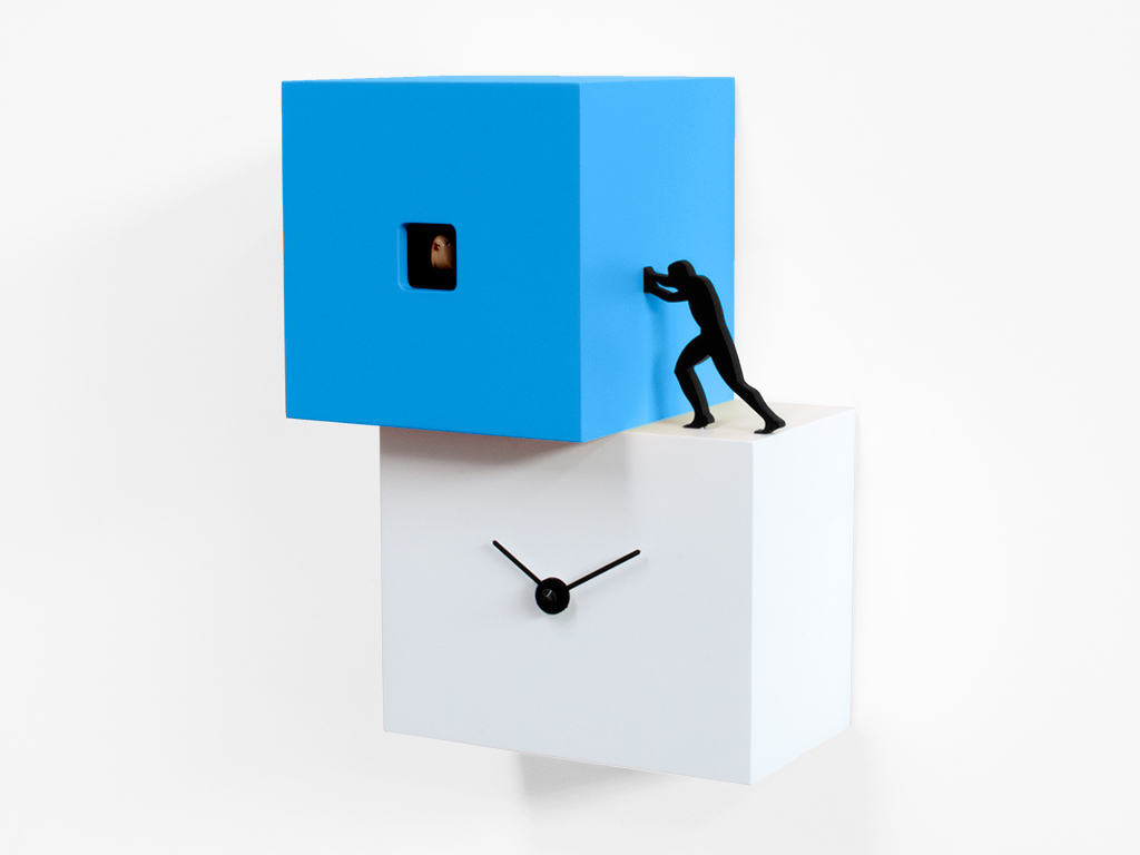 Cuco de pared o mesa compuesto por dos o tres cuerpos de diferentes colores movidos por el trabajo del hombre, un objeto contemporáneo simple pero significativo, fuerte y bien definido. Un cuco que quiere estimularnos, que nos recuerda que el tiempo pasa y que es necesario moverse, encontrar la fuerza y la energía para hacer lo que debemos. Elementos con diferentes tamaños y alturas, colocados de acuerdo con un patrón escalonado, dan vida al Strong Cuckoo de madera pintada. Movimiento de batería de cuarzo. Un sensor sensible a la luz detiene automáticamente el timbre en ausencia de luz.