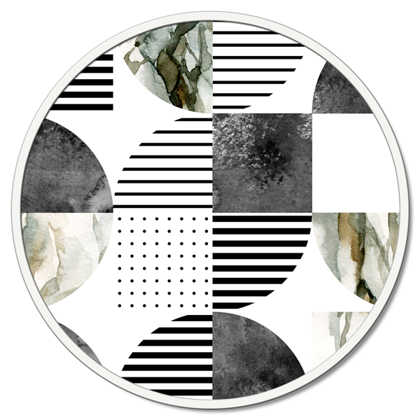 Panel redondo de fibra de madera recubierto de lona de puro algodón estampado en alta definición y con estructura de metal lacado mate.