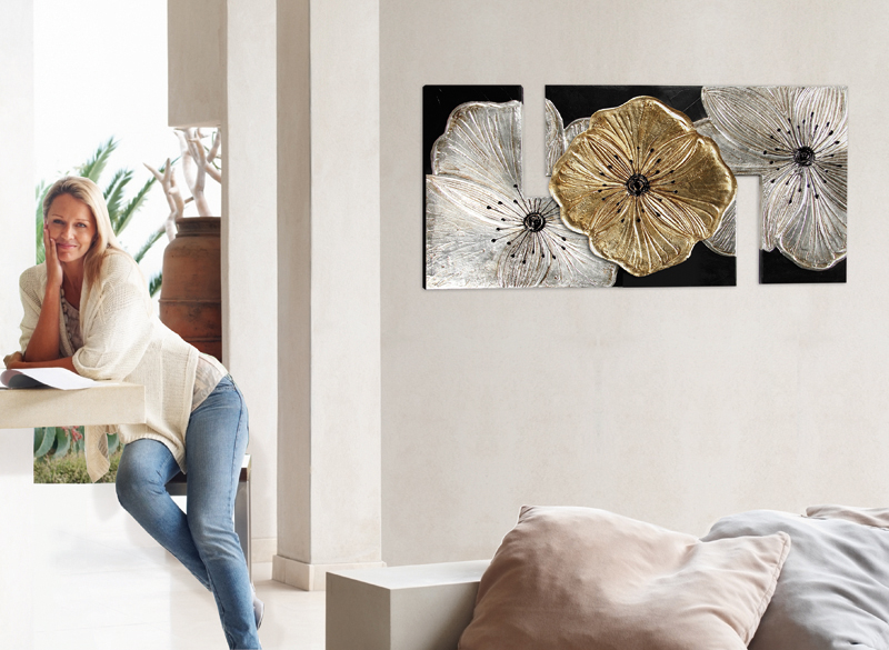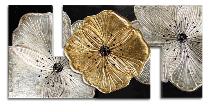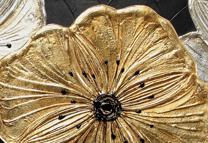 CEPILLO DE DISEÑO cm 115x55 ORO variante Composición floral sobre lienzo, decorada a mano, detalles de resina sobre estructura texturizada, doble elle con elemento central en relieve, acabado brillante.