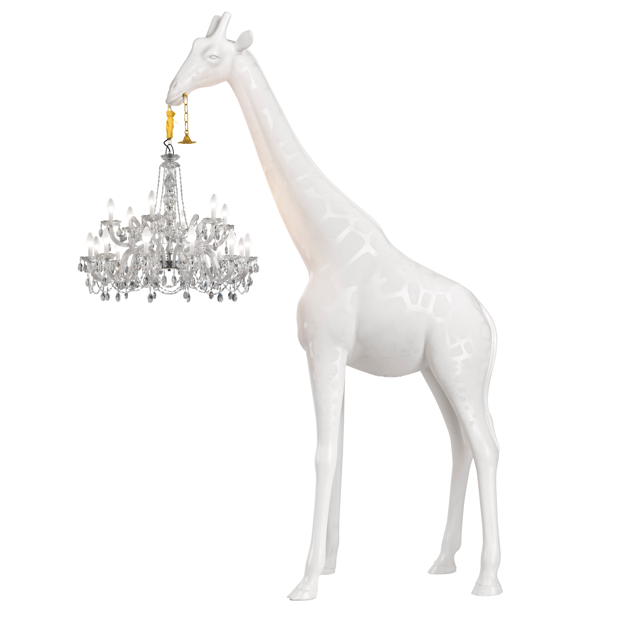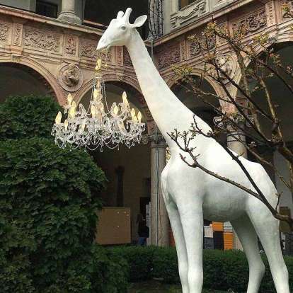 El amor vuelve loca a la gente, todo el mundo lo sabe. Pero, ¿qué pasará cuando la flecha de Cupido golpee a una jirafa de 4 m de altura? Los bocetos visionarios de Marcantonio respondieron a esto creando Giraffe in Love, una jirafa de ensueño que sostiene un candelabro clásico de estilo Marie-Thérèse. Giraffe in Love Outdoor es una jirafa del tamaño de una auténtica jirafa joven, adecuada para ambientes al aire libre, gracias a la lámpara de araña resistente al viento y al agua.