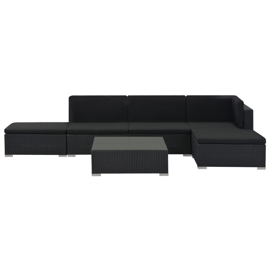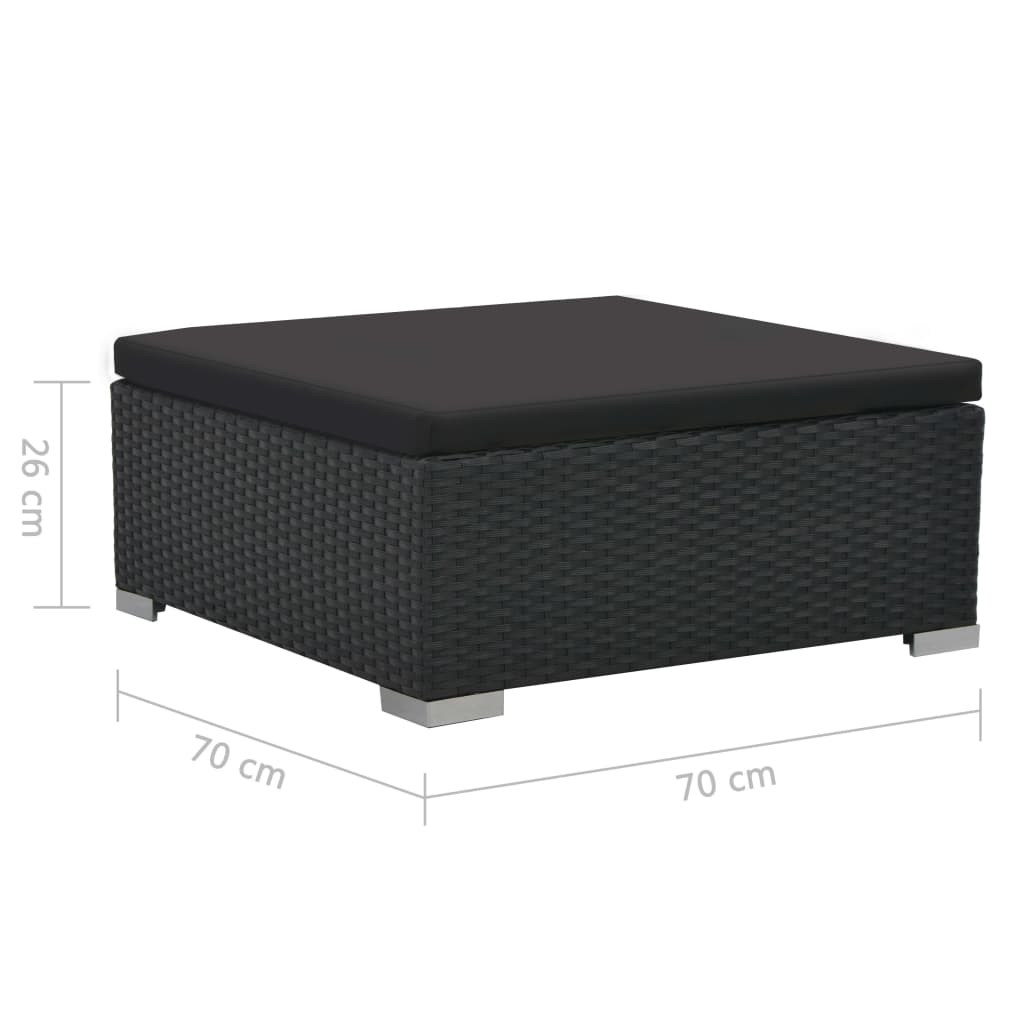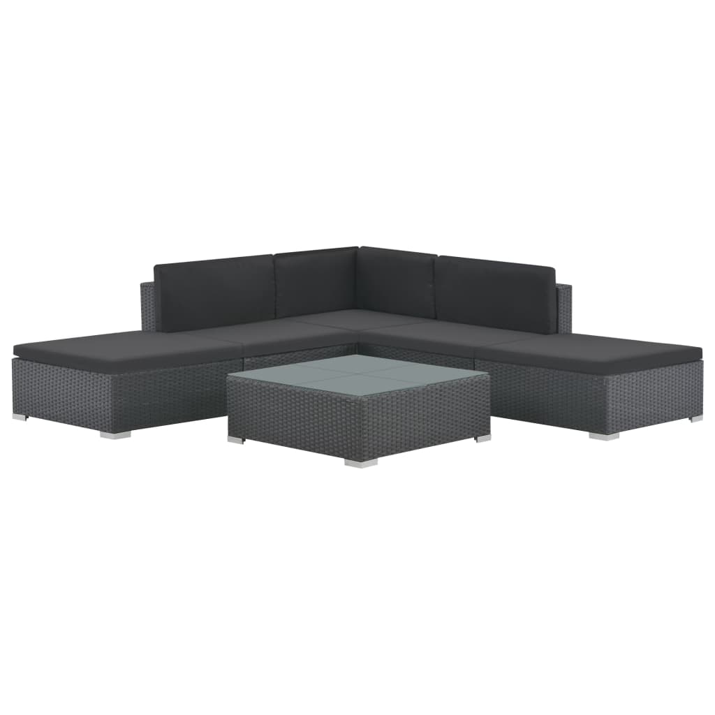 La entrega incluye 1 asiento de esquina, 2 asientos con reposabrazos, 2 taburetes, 1 mesa de centro con tapa de cristal, 5 cojines de asiento y 4 cojines de respaldo.