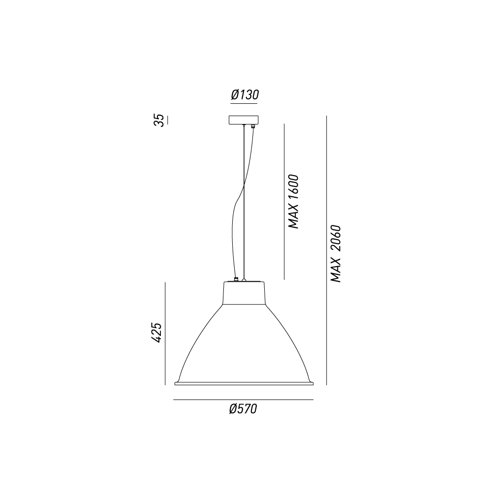 | Difusor: Ø570 mm x h.425 mm; h.max suspensión 2060mm; Roseta Ø130 mm |