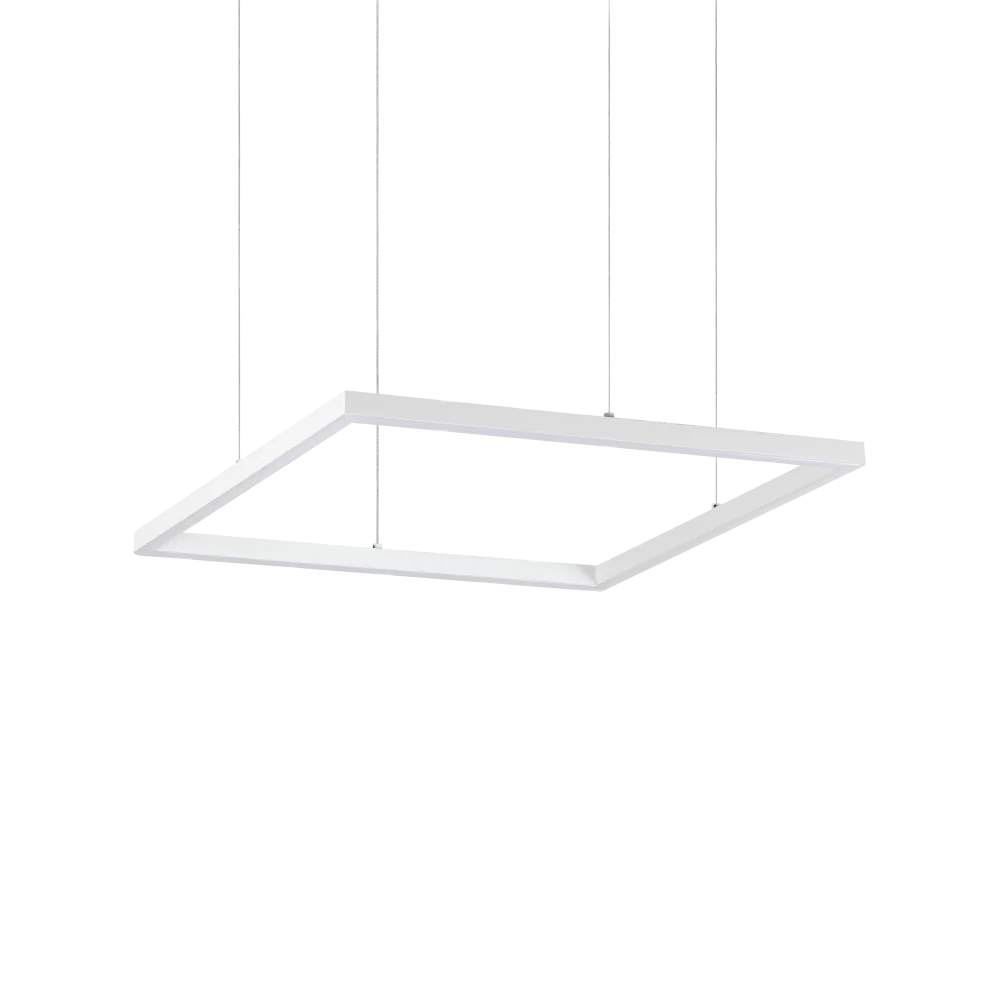 Lámpara colgante compuesta por un fino marco de aluminio pintado en blanco mate o negro y un difusor de policarbonato opalino. Disponible en tres tamaños diferentes. LED integrados, con una temperatura de color de 3000 K y control de encendido y apagado, IRC ≥ 90, vida útil del LED de 50.000 h, protección IP20, clase de protección II.