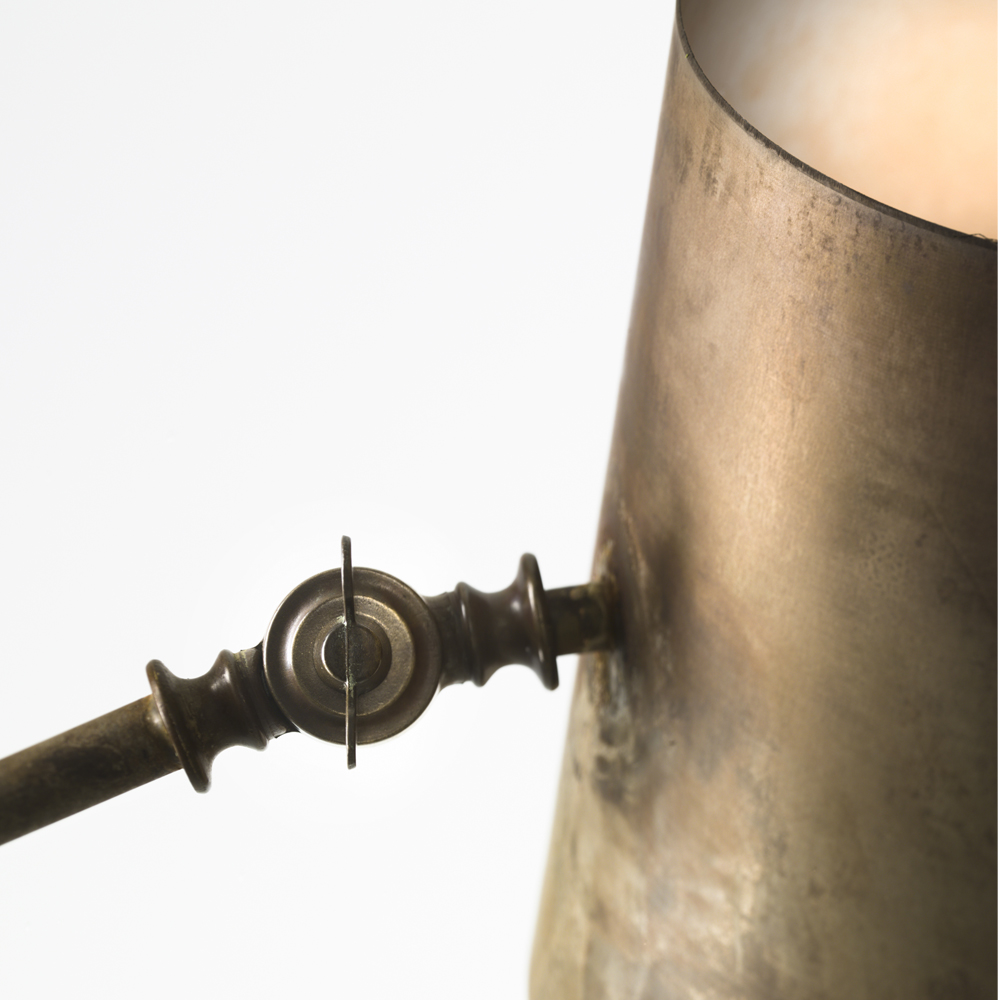 Elementos clásicos y referencias industriales se unen en una colección compuesta por suspensiones, apliques, una lámpara de mesa y una lámpara de pie, disponibles en acabado de hierro con juntas de fundición de latón.