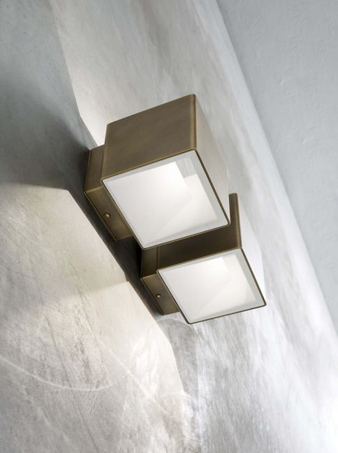 Lámpara de pared de forma geométrica, compuesta por una estructura exterior de latón y un interior reflectante en yeso cerámico (Hobby Ceram).