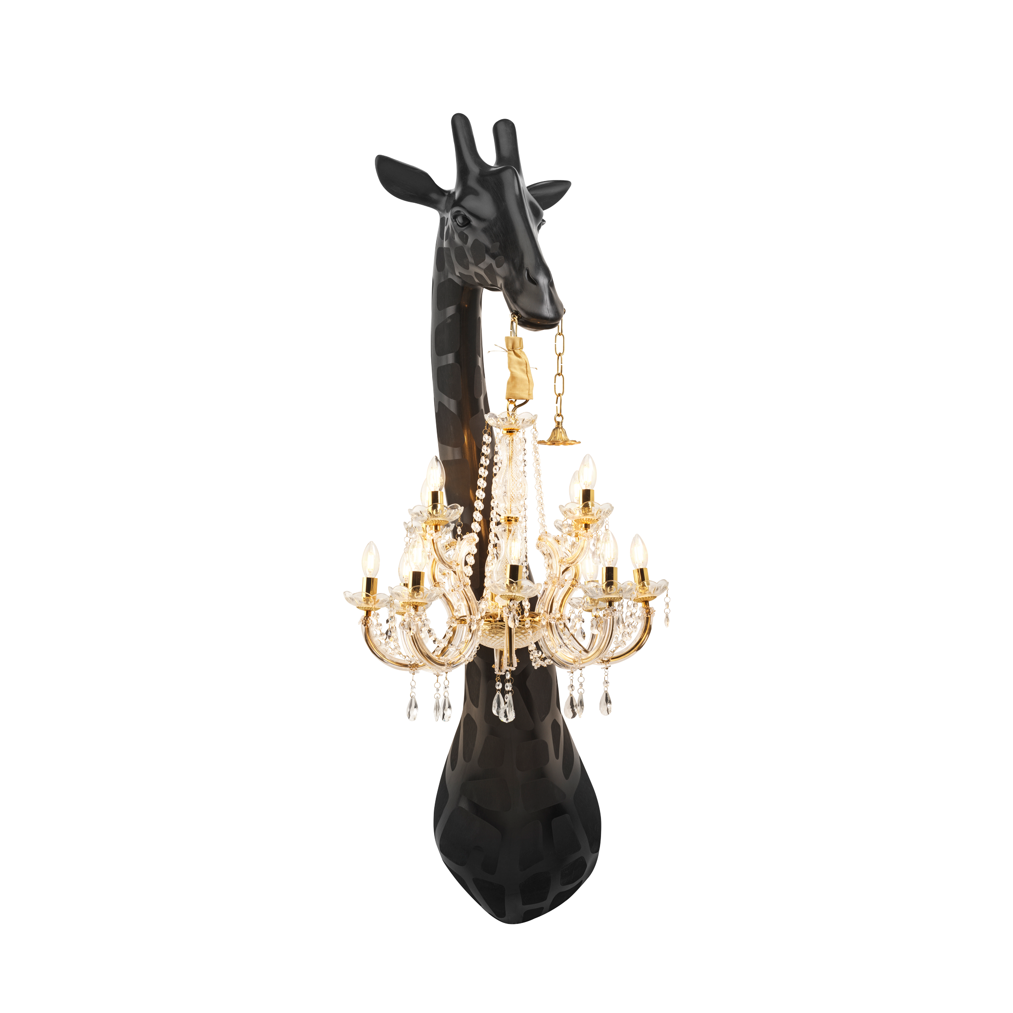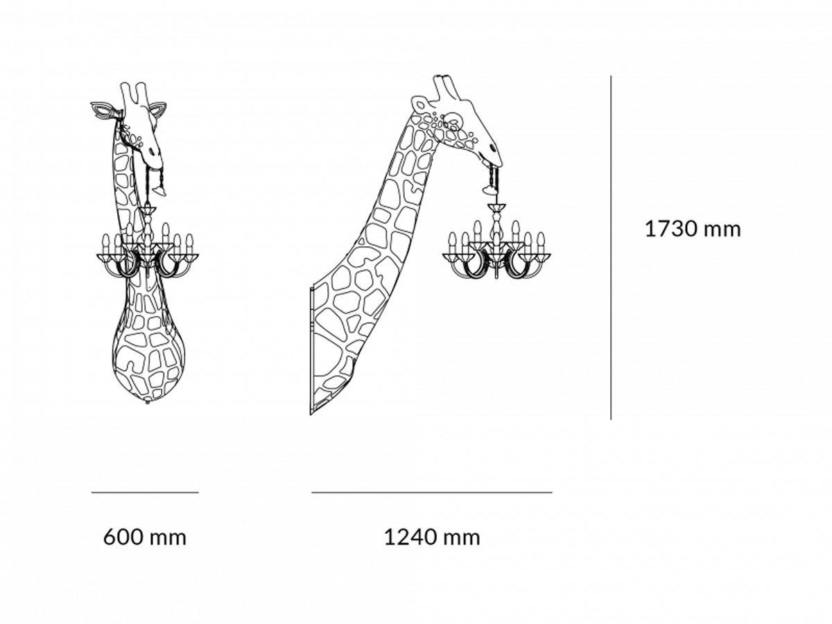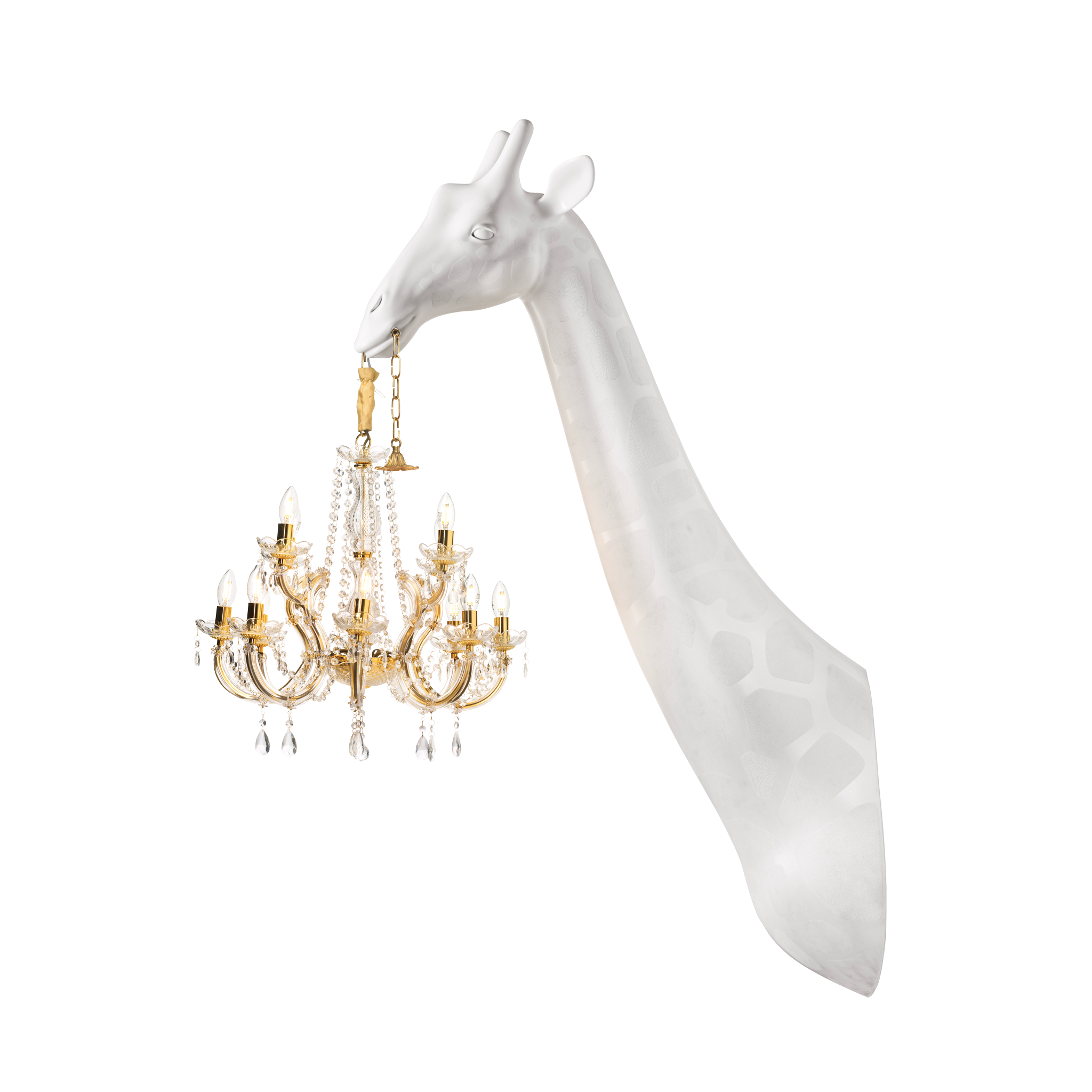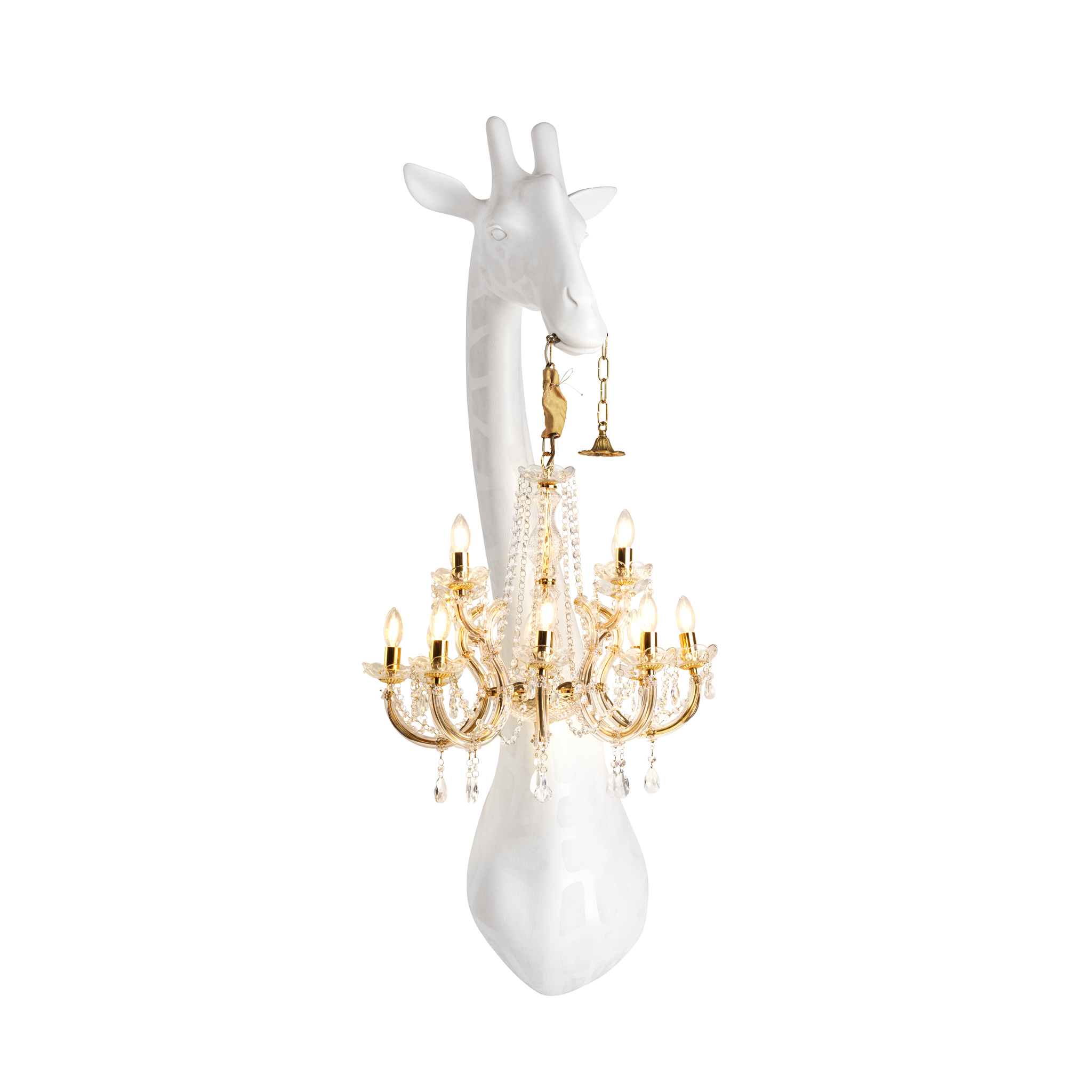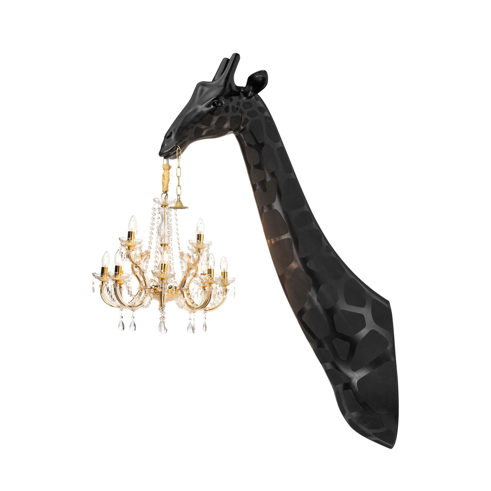 El aplique Giraffe In Love, diseñado por Marcantonio, es un cuello de jirafa que soporta un candelabro clásico de estilo Marie-Thérèse, en versión de pared que permite aportar ironía y ligereza a cualquier espacio vital. Viene con un soporte de metal para colgar en las paredes.