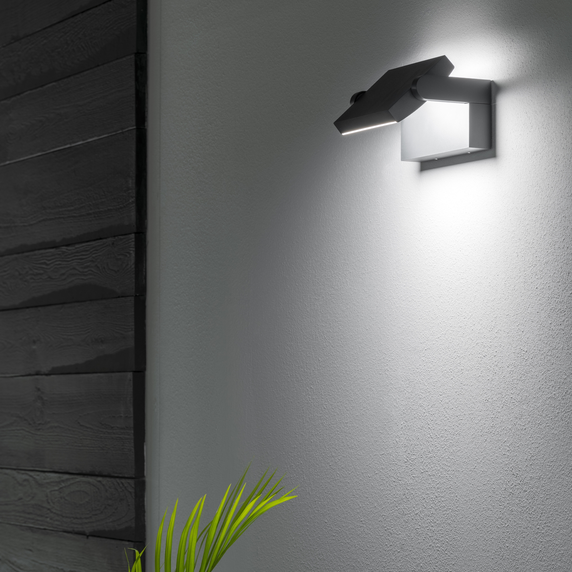 Cuerpo de aluminio con recubrimiento en polvo. Difusor ajustable con pantalla de policarbonato opal brillante. Disponible con sensores crepusculares y de movimiento. Acabados: antracita, blanco, gris, café o negro.