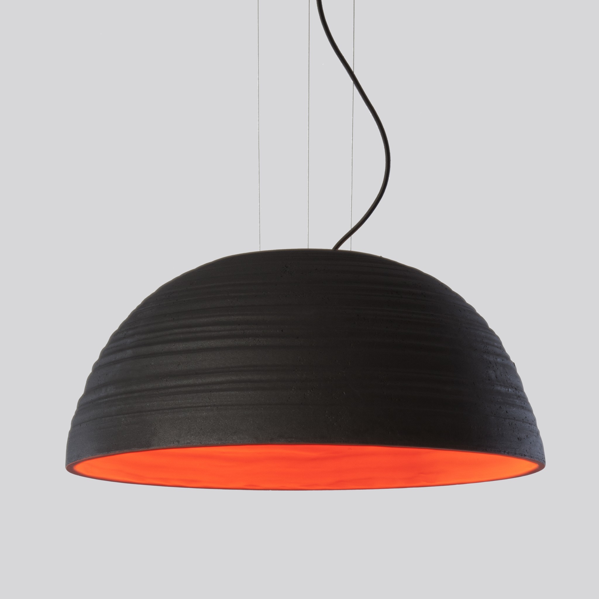 Las suspensiones de la serie NOTORIUS, con su redondez y colores vivos en su interior, son envolventes y crean decoración en estancias amplias. Colores sugeridos: tiza, natural, plomo (para el exterior de la lámpara) / naranja coral, menta, cielo, tiza (para el interior de la lámpara). Disponible en otros colores.