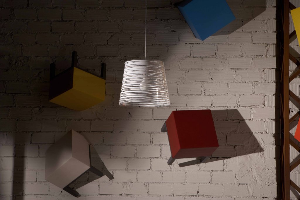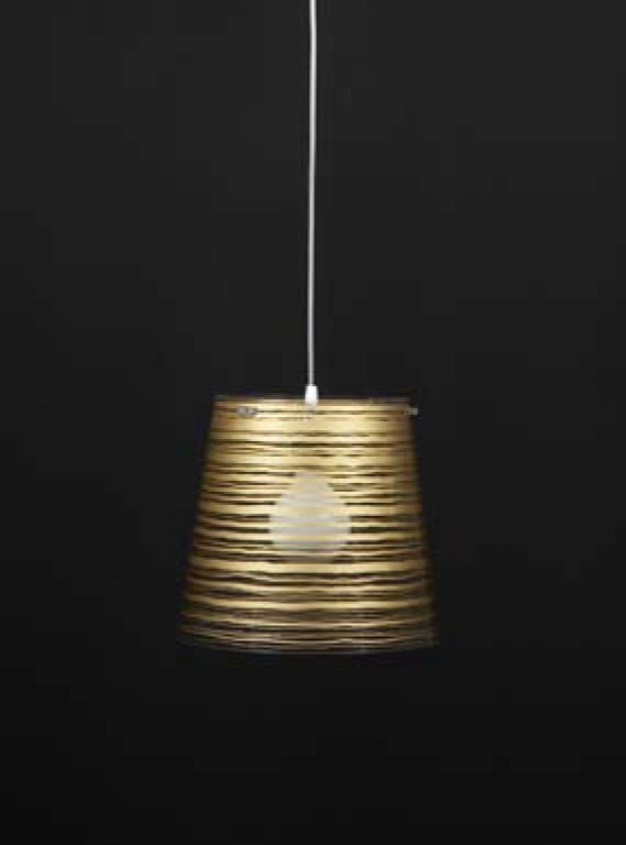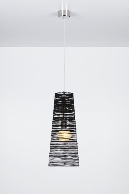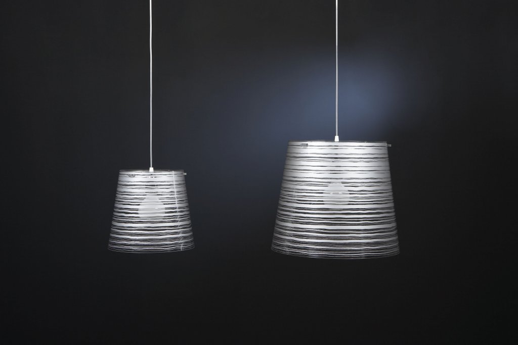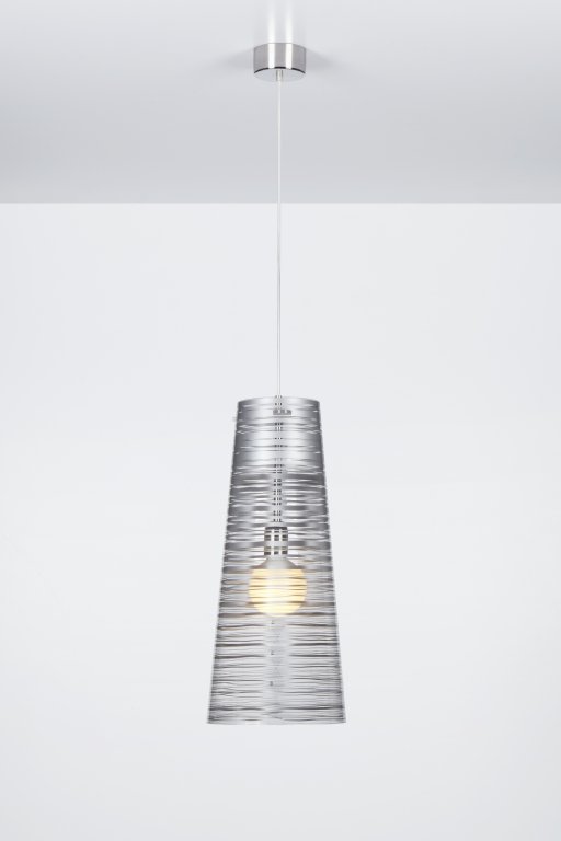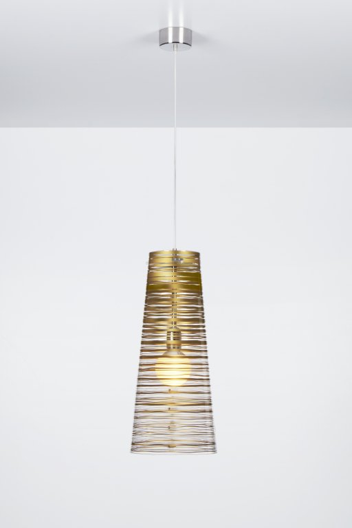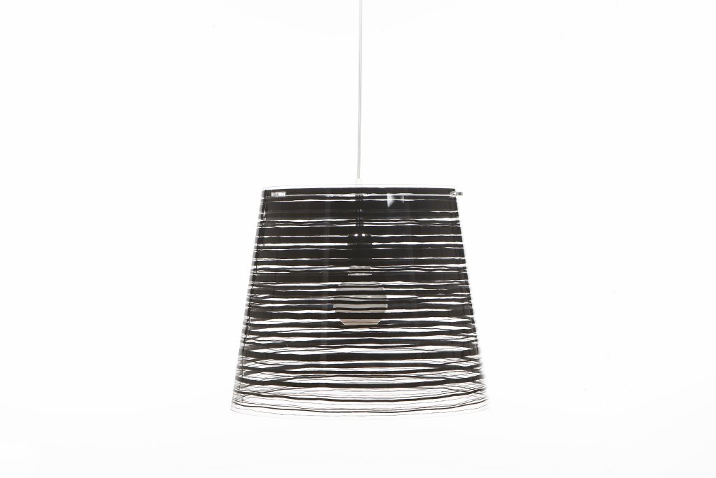 Lámpara de suspensión con pantalla cónica en policarbonato transparente y decoración en diferentes colores, tamaños y formas.