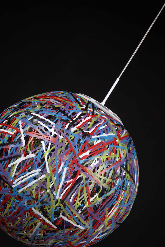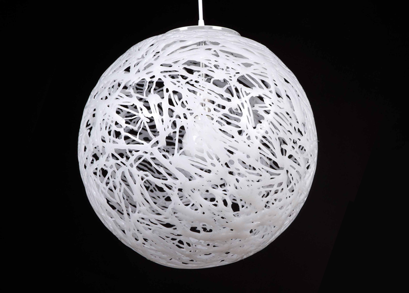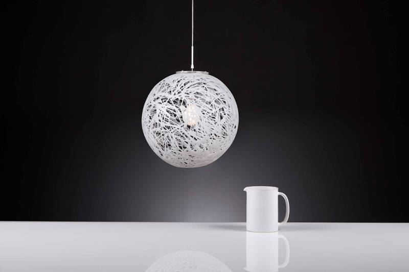 Lámpara de suspensión con pantalla de material plástico termofusionado, parte del cual se deriva del proceso de reciclaje.