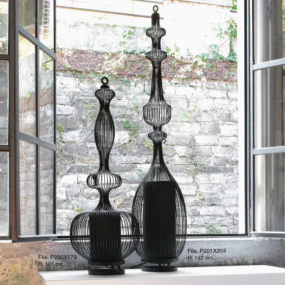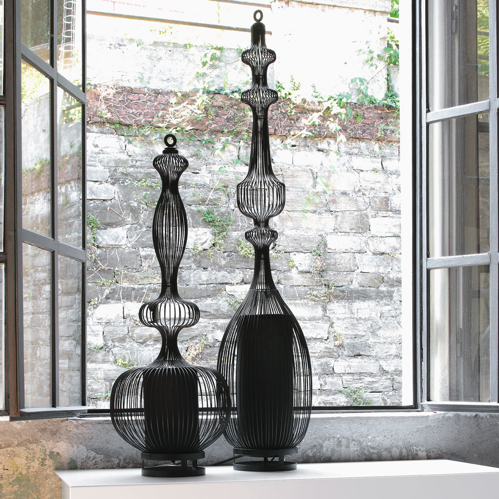 Lámpara de sobremesa, estructura de alambre metálico pintado en color negro.